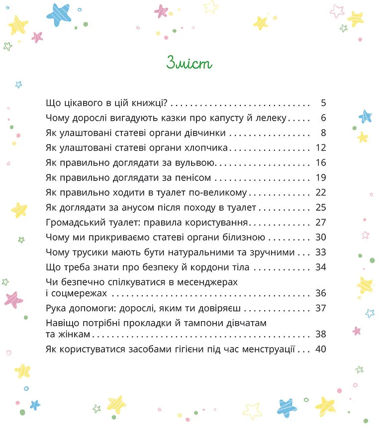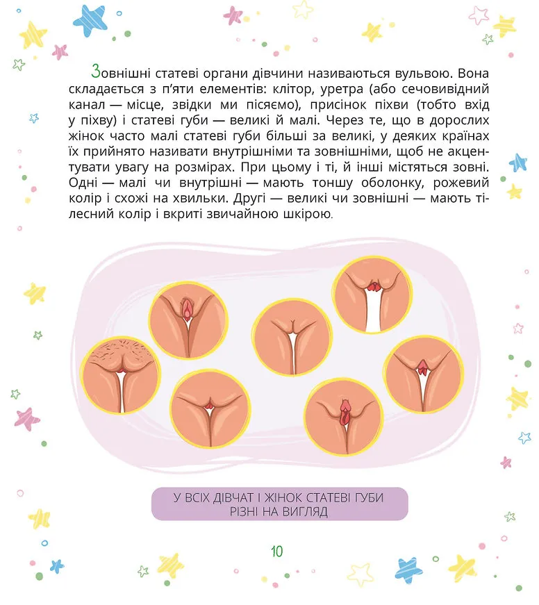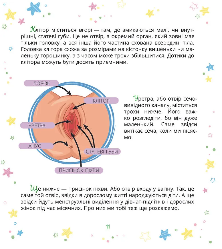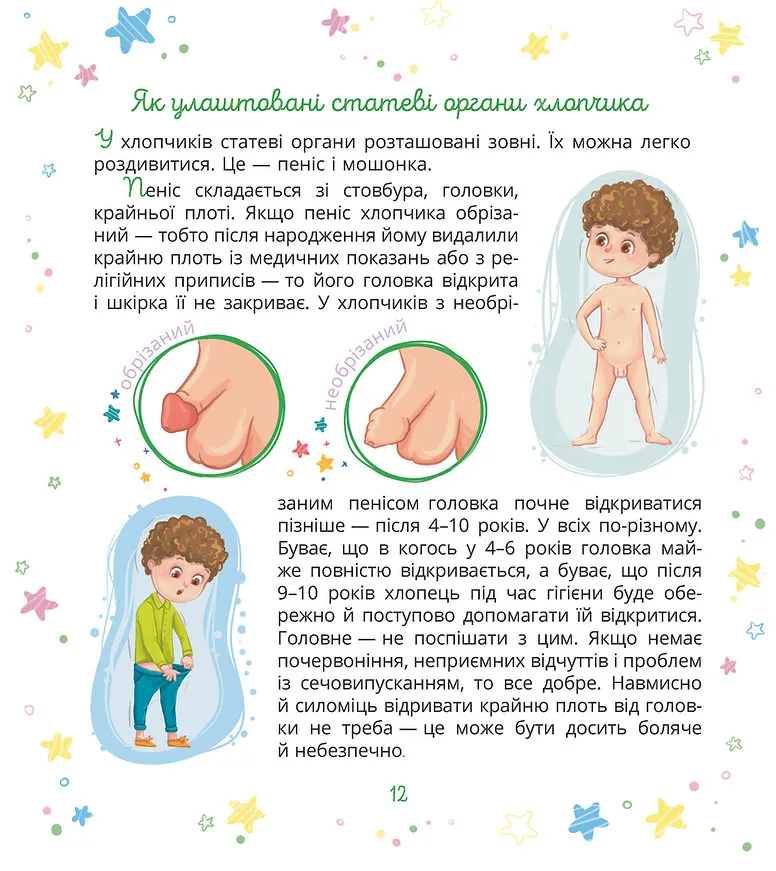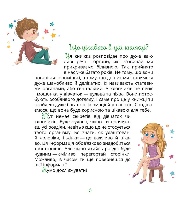 Ця книжка розповідає про дуже важливі речі — органи, які ми прикриваємо білизною. Не тому, що вони некрасиві чи сороміцькі, а тому, що до них ми ставимося дуже шанобливо й делікатно. Їх називають статевими органами, або геніталіями. У хлопчиків це пеніс і мошонка, у дівчаток — вульва й піхва. Ці органи потребують особливого догляду, і саме про них ми й поговоримо.