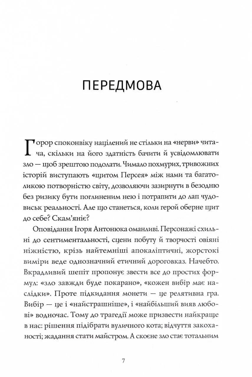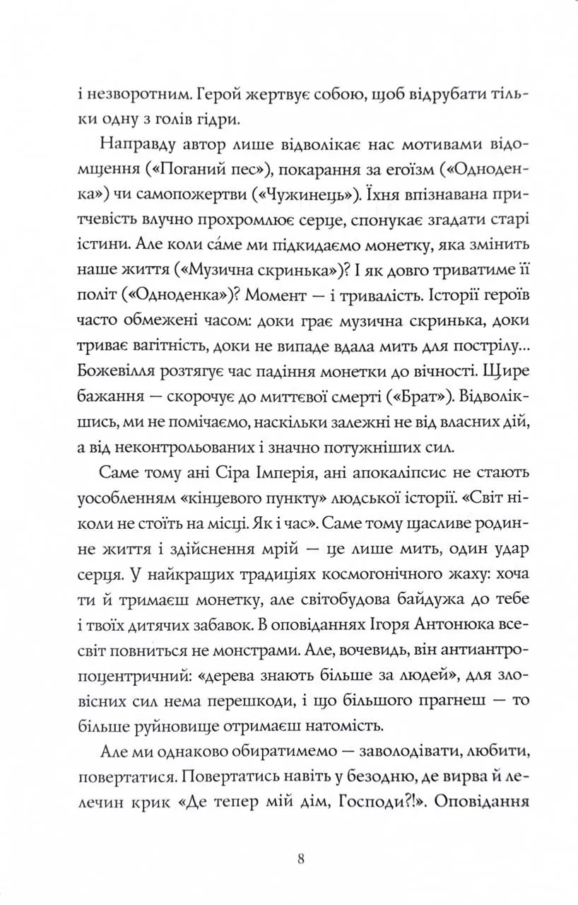 Кожне оповідання збірки — це ніби монета, яку автор вкладає в руки читачеві, заохочуючи зробити доленосний вибір разом з героями. Що станеться, коли молода пара вирішить прихистити вуличного кота? Коли шестирічний хлопчик потайки візьме мамину музичну скриньку? Або п’яна компанія вирушить на полювання? Щойно підкинеш монету — і наслідки вибору стануть фатальними. Когось штовхатиме до прірви монстр із потойбіччя, а когось — власні амбіції, жадоба або просто дурість.