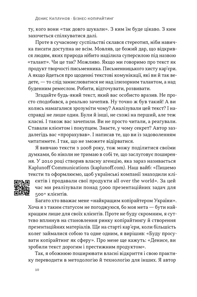 У цій книжці Денис Каплунов на прикладах послідовно розповідає, як писати не просто цікаво та зрозуміло, а й впливати на людей. Це синтез письменництва, реклами, маркетингу, частково — поведінкової економіки і психології продажу. Ви довідаєтеся, як привертати увагу клієнтів, показувати вигоди комерційної пропозиції, знімати всі заперечення й мотивувати до дії, а як наслідок — переконувати текстами й будувати репутацію серйозного фахівця. У цьому вам допоможуть хороші і погані приклади, вправи для самостійної роботи та опис характеристик, які зроблять ваші тексти ефективними.