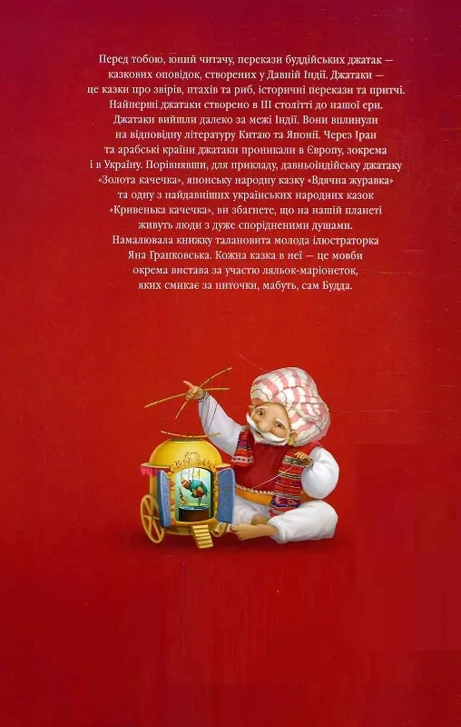 Відкрийте чарівний світ джатак – давніх індійських казок про попередні втілення Будди! Це історії про тварин, які розмовляють, про чарівні пригоди і мудрі уроки. Яскрава ілюстраторка Яна Гранковська оживила цих казкових героїв, наділивши їх яскравими кольорами та незвичайними образами. Подорожуючи сторінками цієї книги, ви зустрінете мудрих слонів, хитрих лисиць та відважних левів. Кожна казка – це маленька вистава, де ляльки-маріонетки оживають під чарівною мелодією. Дізнайтеся про доброту, співчуття і мудрість разом з героями джатак!