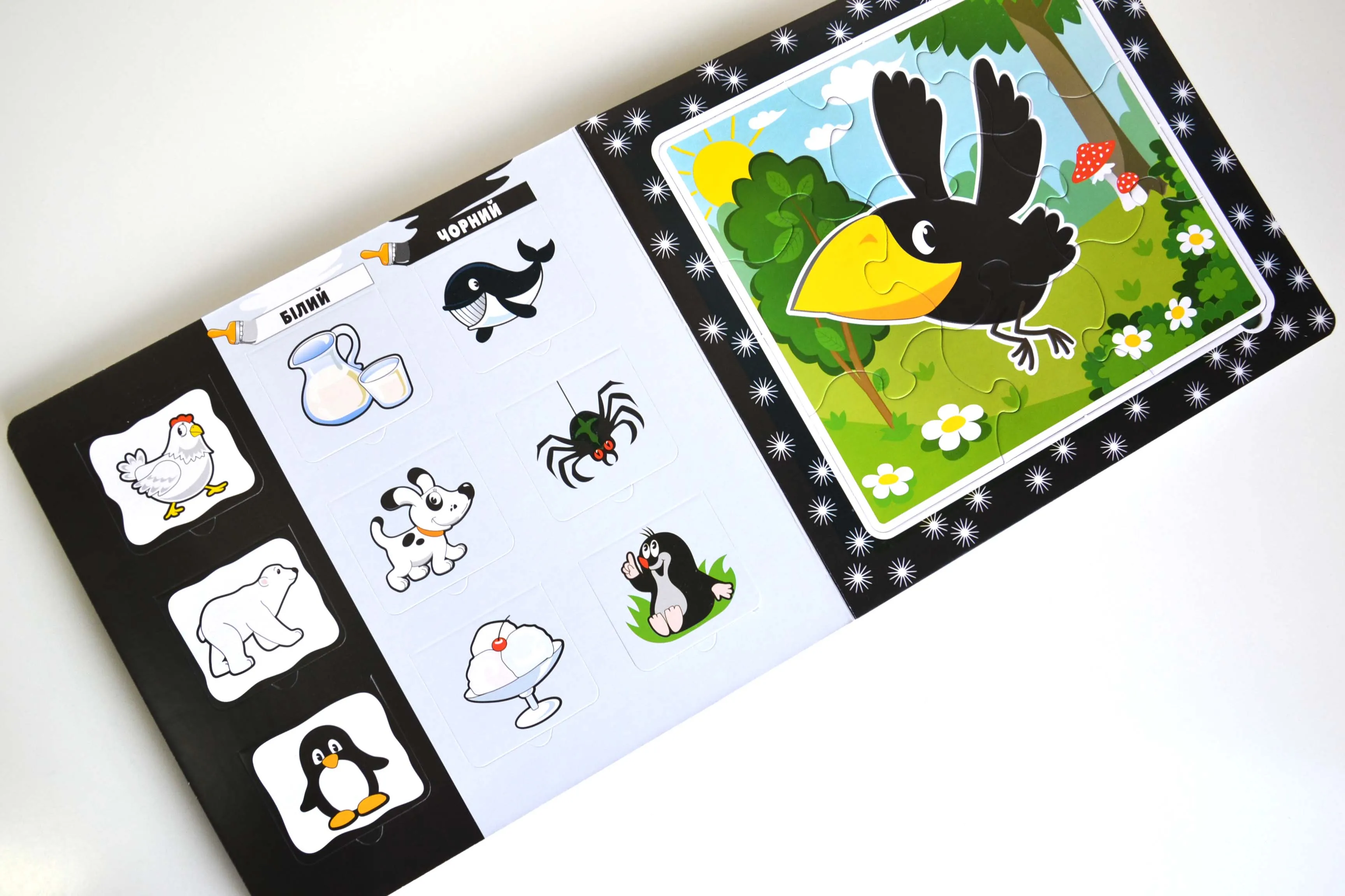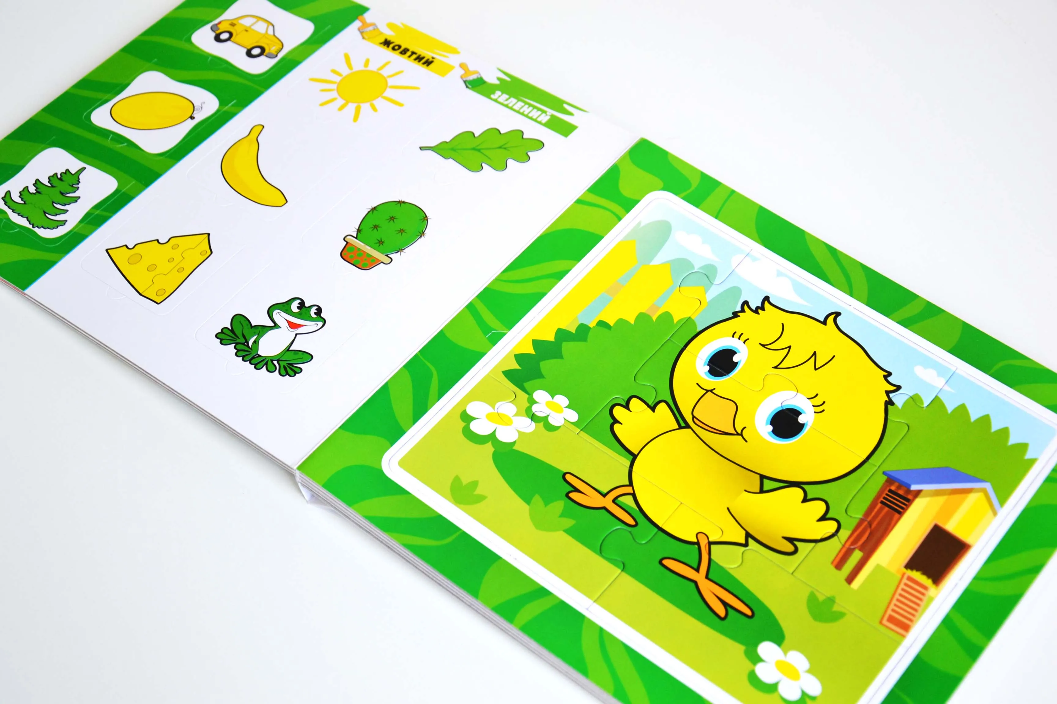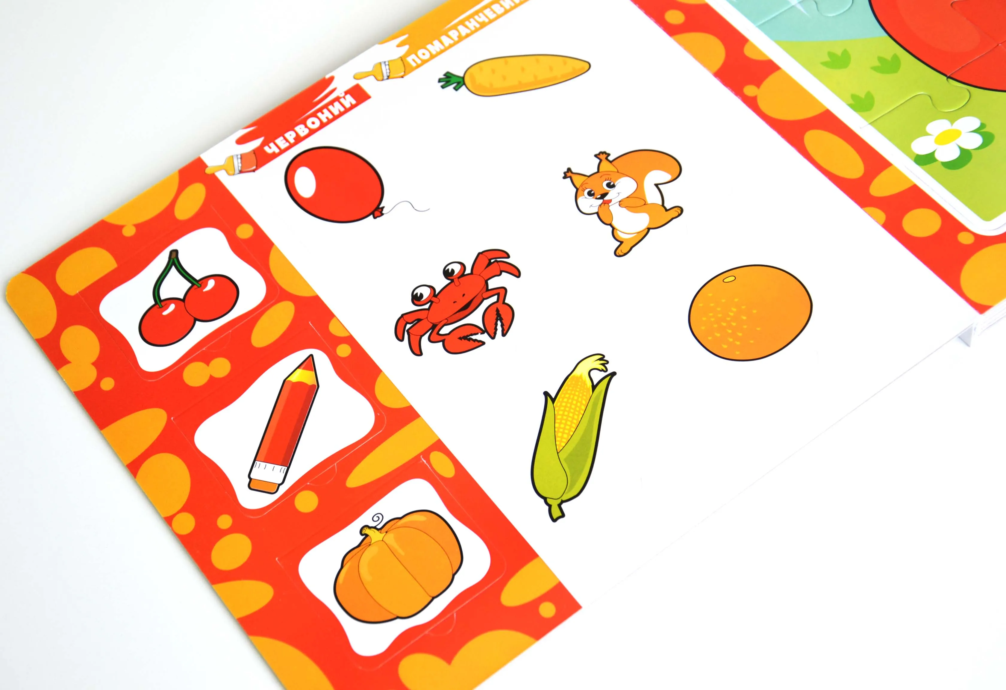 Книжка-пазл з віконцями. Кольори — чудова навчальна гра для малечі, яка допоможе легко і весело вивчити основні кольори. На кожній сторінці дитина знайде яскраві ілюстрації та відкриє заховані під віконцями картинки, що демонструють різноманітні предмети різних кольорів. Малюк зможе асоціювати кольори з реальними об'єктами, такими як фрукти, квіти чи іграшки, розвиваючи свою увагу, пам'ять і спостережливість. Ця інтерактивна книжка робить навчання барвистим і захопливим, додаючи процесу вивчення кольорів елемент гри!