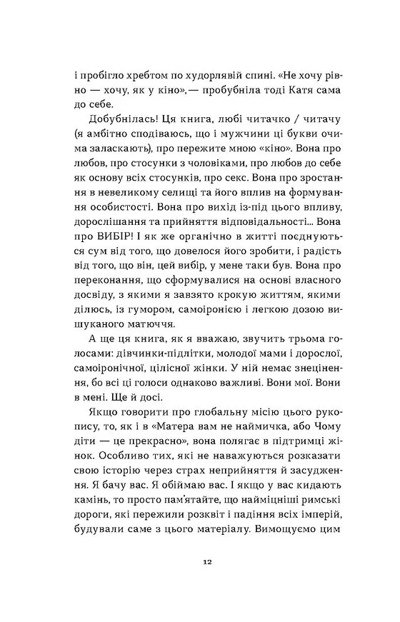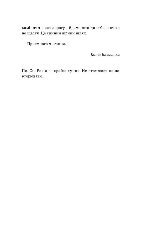 Катя Бльостка звертається до всіх, хто хоча б раз у житті сумнівався в тому, чи обрав правильний шлях у стосунках. Її сміливий стиль, гумор і самоіронія роблять читання легким, але водночас надзвичайно глибоким. Ця книга — про внутрішню силу, про вибір бути собою, навіть якщо це складно, і про те, що справжня любов починається із самоповаги.