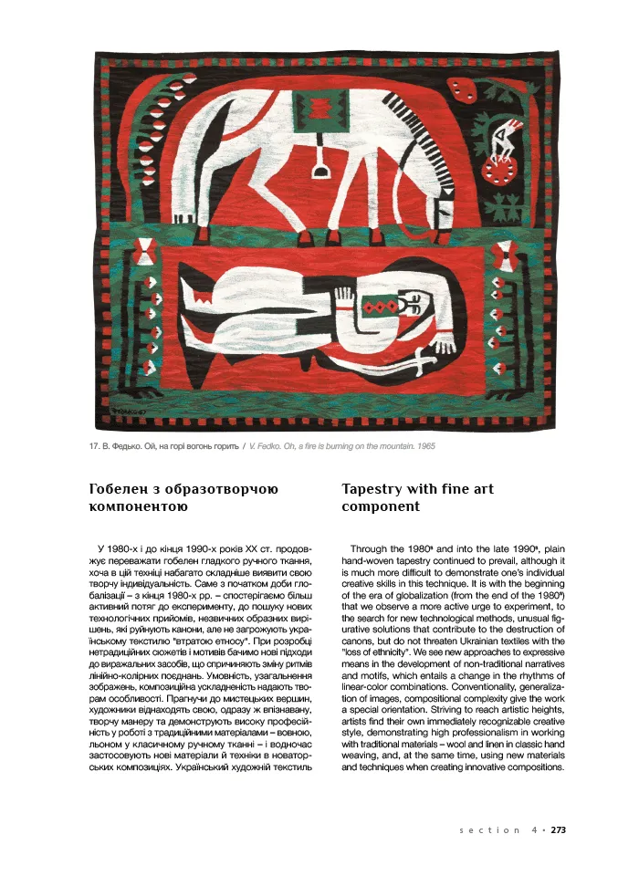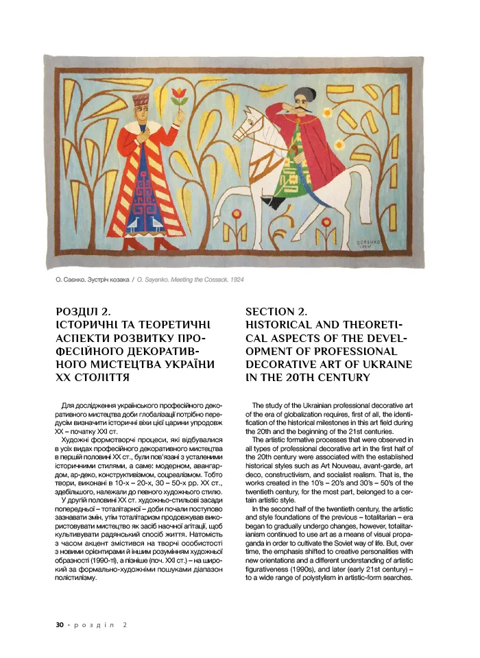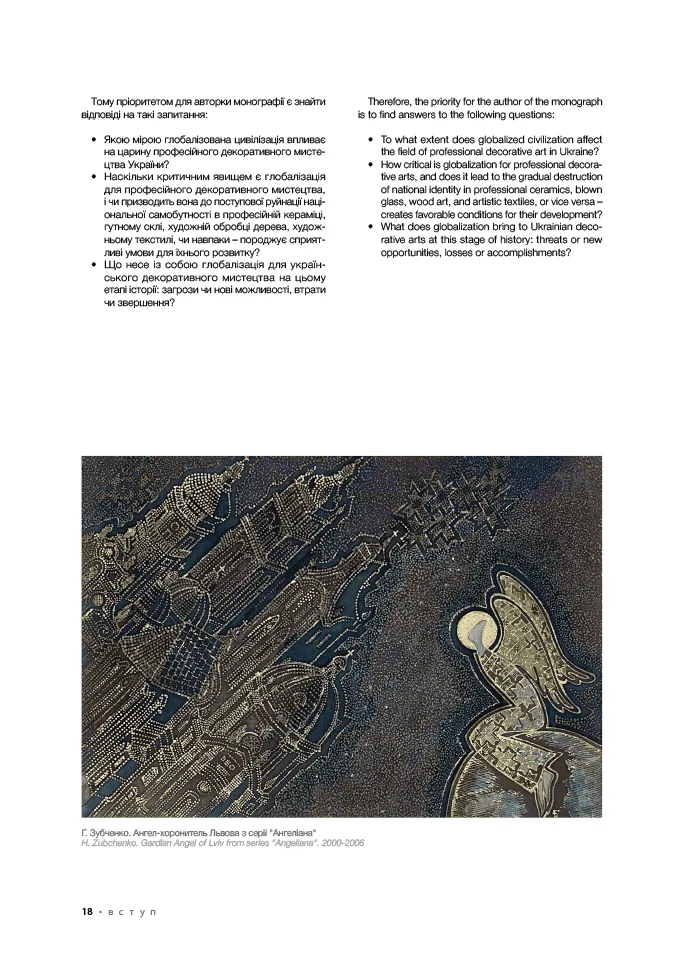 Книга пропонує аналіз широкого історико-культурного матеріалу, що дозволило авторці виявити та розкрити значні образно-пластичні й художньо-стильові трансформації в добу глобалізації в таких видах професійного декоративного мистецтва України як кераміка, скло, художня обробка дерева, гобелен, батик, нетрадиційний текстиль. Дослідниця вважає, що культурна глобалізація підштовхує українських митців декоративного мистецтва у їхній творчості до національної ідентифікації, спрямовує до пошуків архетипів своєї культури, стимулює до збереження національної самобутності. Тому входження українського професійного декоративного мистецтва на зламі ХХ-ХХІ ст. у світовий контекст не викликає небезпеки розчинення в ньому. Авторка переконливо доводить, що історично утворене, але осучаснене професійне декоративне мистецтво, яке спирається на багатовікові традиції унікальної культурної спадщини, є ґрунтом для поширення в суспільстві України доби глобалізації ознак національно-культурної ідентичності.