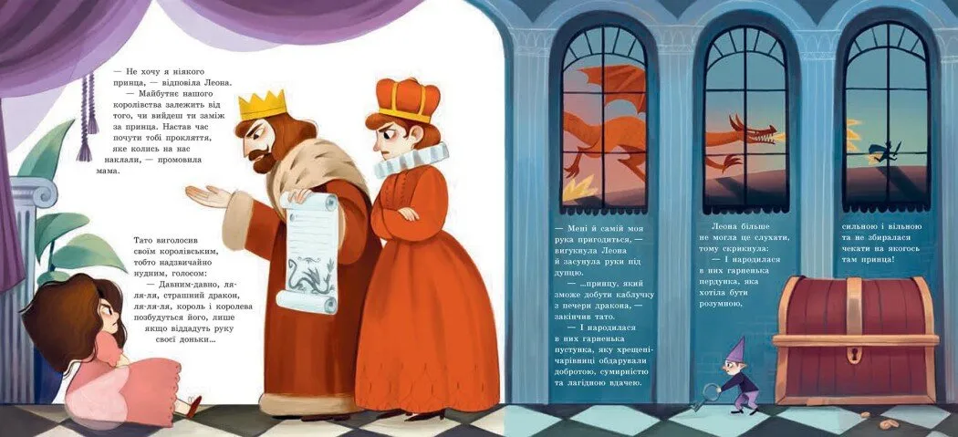 У цій казці все перевернуто догори дриґом! Принцеса Леона зовсім не така, як у звичних казках — вона не сидить у замку, а висить на люстрі, мріючи про свободу та силу. Коли король і королева пропонують їй класичну казкову історію, Леона відмовляється, бо хоче більшого: бути розумною, незалежною та щасливою. Вона вирушає на пошуки своєї власної історії.