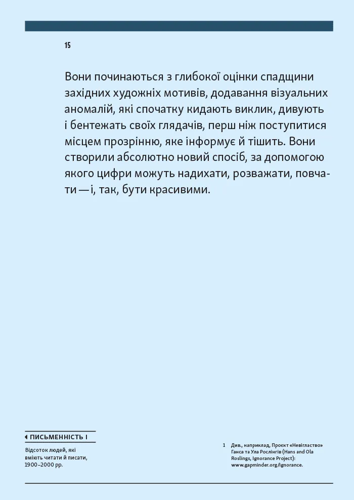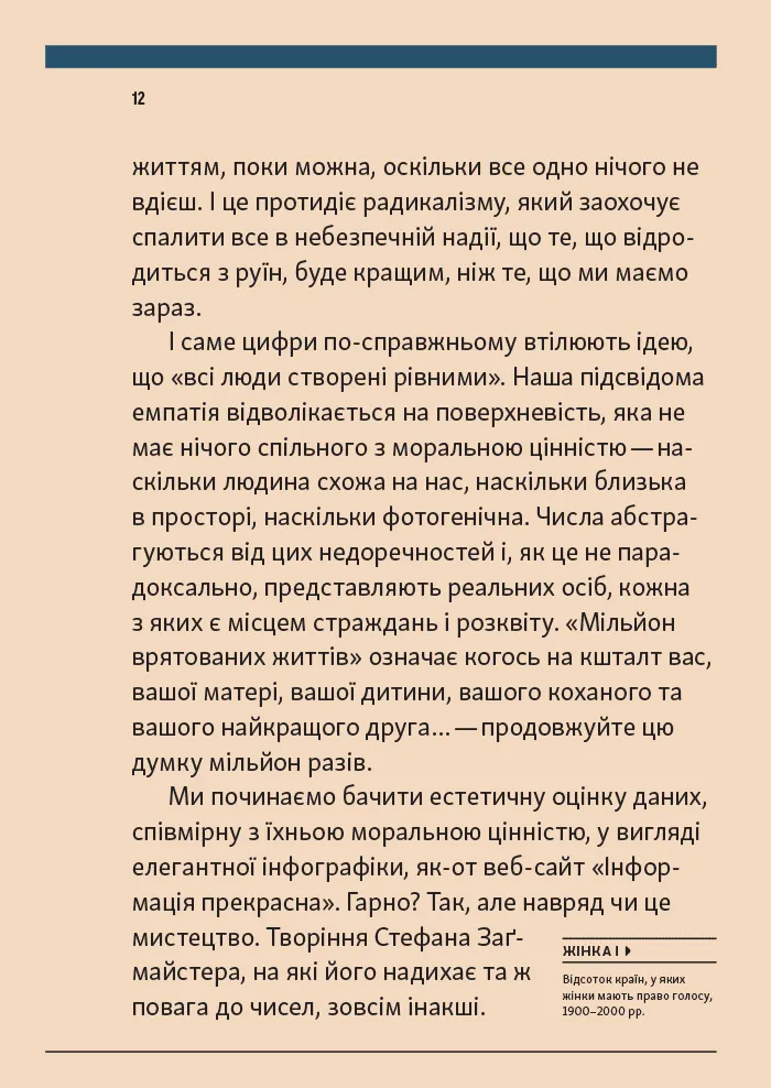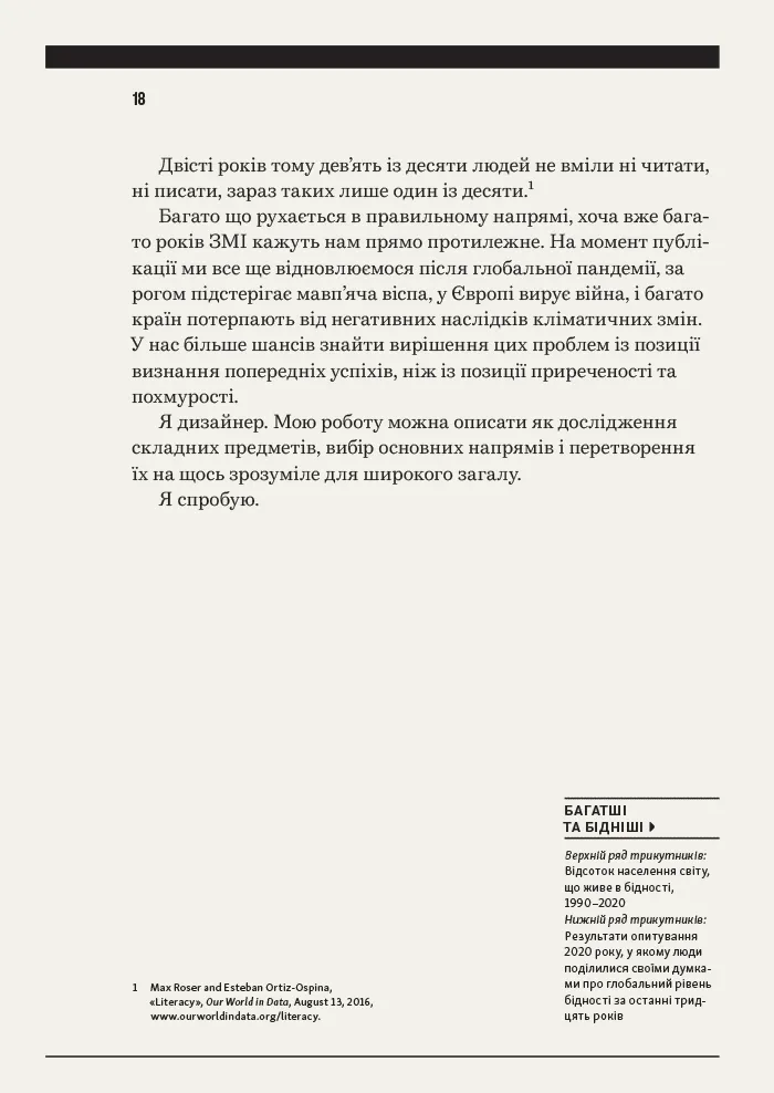 Ця книжка — своєрідний огляд мистецько-просвітницького проєкту Стефана Заґмайстера, у межах якого він презентує реальні дані щодо розвитку нашої цивілізації останніх десятиліть і століть за допомогою деконструкції й переосмислення витворів мистецтва минулого. Ці роботи в супроводі авторських коментарів і роздумів мають цілком благородну мету: створити противагу негативу, який поширюють медіа задля привернення уваги публіки, і наголосити, що попри всі лиха й страждання людство рік за роком неухильно рухається до довшого, здоровішого і щасливішого життя.Ось як декларує свій намір сам Стефан Заґмайстер:«Якщо подивитися на розвиток людства в довгостроковій перспективі, більшість аспектів нашого життя значно покращилися. Менше людей голодують, менше людей гинуть на війнах або внаслідок стихійних лих, і більше людей, ніж будь-коли раніше, мешкають у демократичних країнах, а до того ж живуть набагато довше. Двісті років тому дев’ять із десяти людей не вміли ні читати, ні писати, зараз таких лише один із десяти.