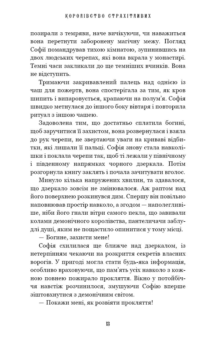 Емілія не може отямитися після шокуючого викриття про свою сестру Вітторію. Та перш ніж зіткнутися з демонами свого минулого, вона прагне завоювати свого короля, спокусливого князя Гніва. Вона прагне не лише його тіла, а й серця та душі. Утім цей демон не може їй цього пообіцяти, бо має свої секрети, відомі лише його братам. Емілія та Гнів грають у гріховну гру обману, щоб розкрити загадкове вбивство, у якому звинувачують Вітторію. Між відьмами, демонами, перевертнями й Нечестивими назріває протистояння, яке може спалахнути кровопролитною війною і загрожує знищити пекло. Емілію застерігали: коли заходиться про потойбіччя, то ніщо не є таким, як видається. Тож постає питання: чи всі, хто перебуває в пеклі й постійно плете інтриги довкола юної відьми, насправді прокляті лиходії? «Королівство Страхітливих», ця романтична історія із сексуальними таємницями й несподіваним поворотом сюжету, завершує динамічну серію книг Керрі Маніскалко під назвою «Королівство Нечестивих».