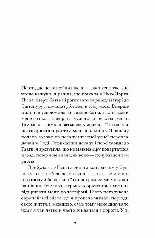 У романі про перекладачку, яка покидає Нью-Йорк на пошуки нового життя в Гаазі, розгортається складна історія, пронизана темами любові, зради та морального вибору. Вона приїздить до Міжнародного суду, сповнена надії знайти своє місце у світі, де її знання мов та досвід у різних країнах можуть стати в нагоді.