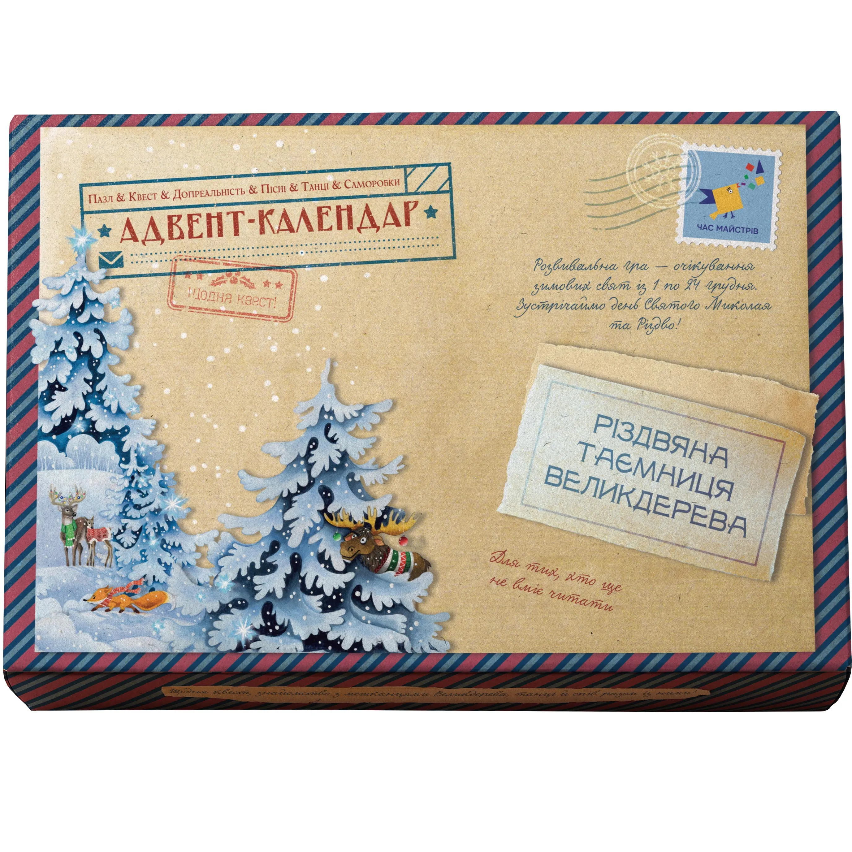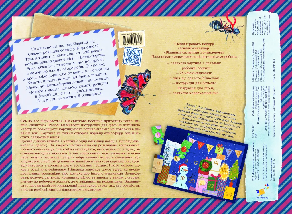 Адвент-календар «Різдвяна таємниця Великдерева» — ідеальний спосіб створити чарівну атмосферу зимових свят для малечі! Це не просто календар, а ціла пригода, яка дарує дітям можливість поринути у світ магії, творчості та знань. Щодня вони відкривають новий пазл, знайомляться з дивовижними мешканцями Великдерева, беруть участь у квестах, танцюють, співають і навіть виконують цікаві завдання в робочому зошиті. З кожним відкриттям перед дитиною постає нова частинка захопливої різдвяної історії, яку супроводжує віртуальна наставниця від видавництва «Час майстрів».