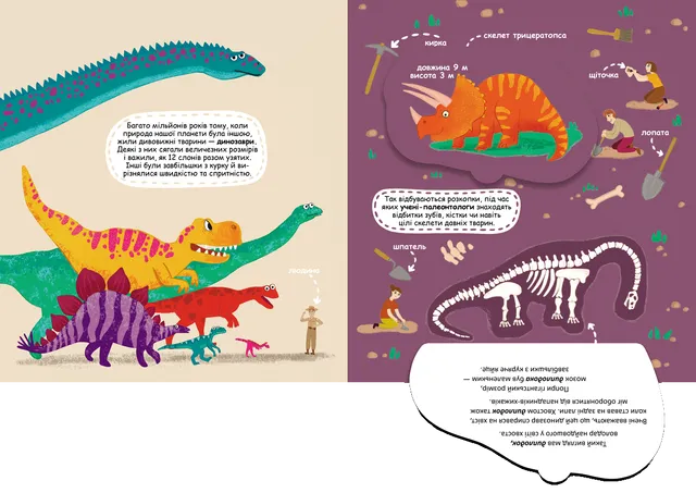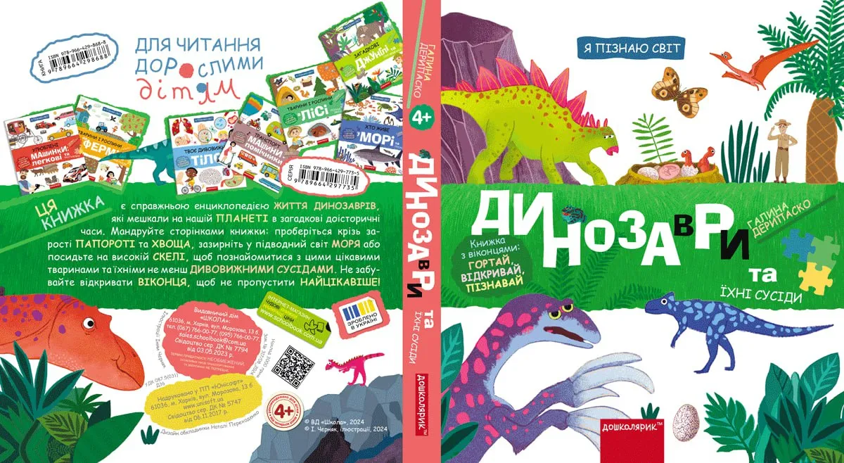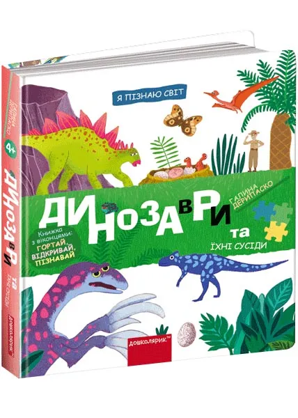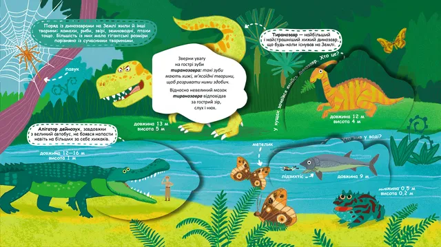 Для читання дорослими дітям Ця книжка є справжньою енциклопедією ЖИТТЯ ДИНОЗАВРІВ, які мешкали на нашій ПЛАНЕТІ в загадкові доісторичні часи. Мандруйте сторінками книжки: проберіться крізь зарості ПАПОРОТІ та ХВОЩА, зазирніть у підводний світ МОРЯ або посидьте на високій СКЕЛІ, щоб познайомитися з цими цікавими тваринами та їхніми не менш ДИВОВИЖНИМИ СУСІДАМИ. Не забувайте відкривати ВІКОНЦЯ, щоб не пропустити найцікавіше!