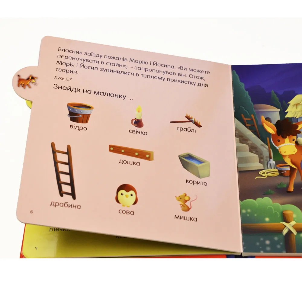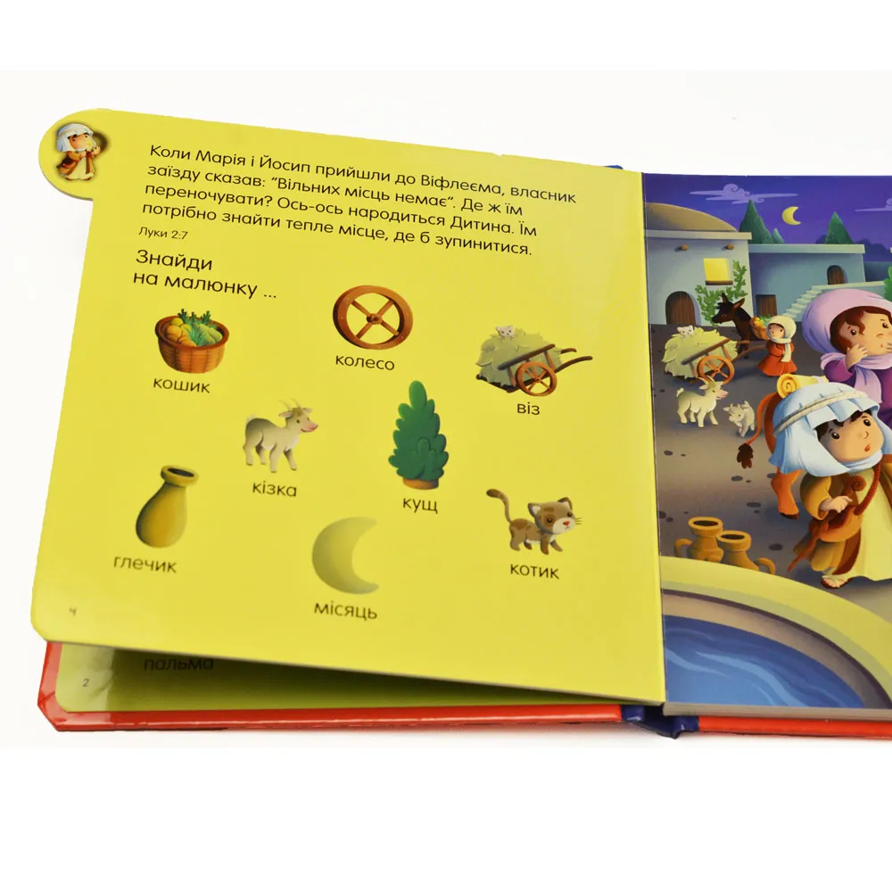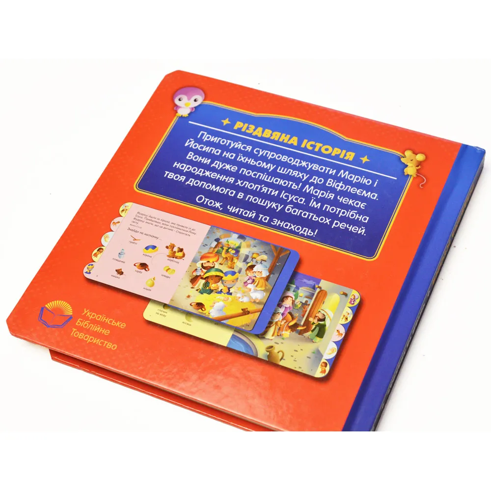 Ця книжка не тільки розповість цю різдвяну історію, але і яскравими ілюстраціями покаже, як це було. Тому автори закликають малюків приготуватися супроводжувати Марію і Йосипа на їхньому шляху до Віфлеєма та виконати кілька цікавих завдань.