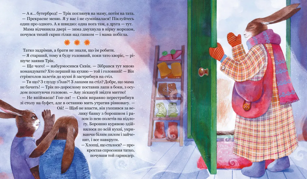 Перед Різдвом зазвичай всі приємно заклопотані пошуком подарунків і плануванням свята. Та на родину зайців чекали самі халепи. Ще й такі, що будь-хто зневірився б. Однак не герої цієї історії! Мама, тато й двоє зайченят, Сквік і Трік, не лише витримають усі випробування долі. Їхня родина стане міцнішою, а діти з вічних суперників і конкурентів перетворяться на дружних братів, які підтримують один одного. Ця книжка для всіх, хто шукає злагоди з братом чи сестрою. Для всіх, хто вірить, що диво можна створити власними лапами.