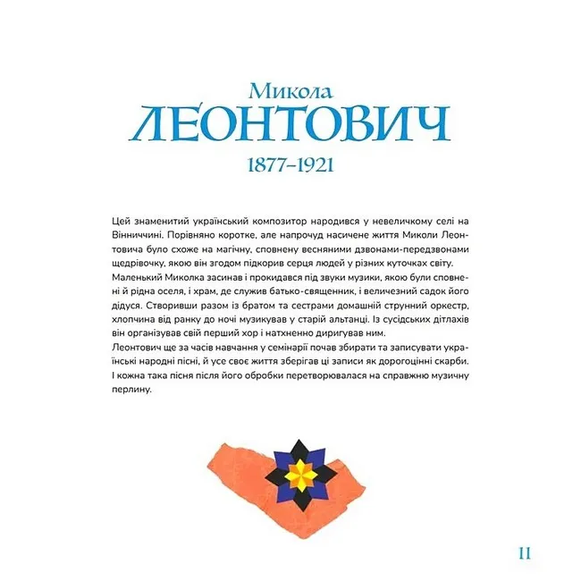 “Музична Україна. 12 українських композиторів ХХ-ХХІ ст.” – це збірка есеїв про видатних українських композиторів, чия творчість стала частиною світової музичної спадщини. У книзі представлені цікаві факти з біографій цих геніальних митців та інформація про найкращі твори української класичної музики, виконані провідними українськими музикантами, серед яких скрипалька Богдана Півненко, Національний ансамбль солістів «Київська камерата» та академічний камерний хор «Київ».