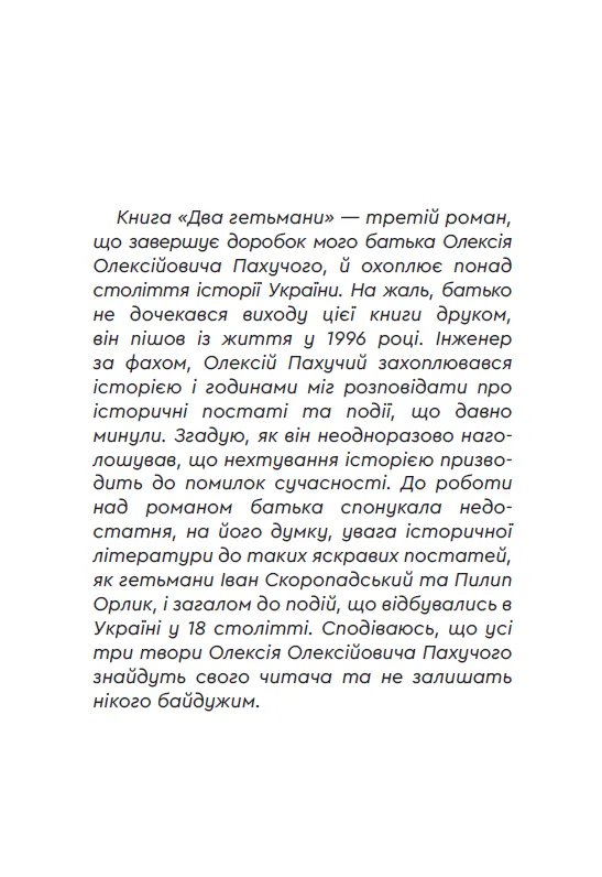 «Два гетьмани» — історичний роман, що переносить читача у драматичну добу української історії після Полтавської битви. Автор майстерно змальовує складні перипетії життя двох гетьманів: Івана Скоропадського та Пилипа Орлика. Ці постаті, попри відмінність у характерах, віці та методах, об’єднані спільною метою — зберегти Україну від московського поневолення.