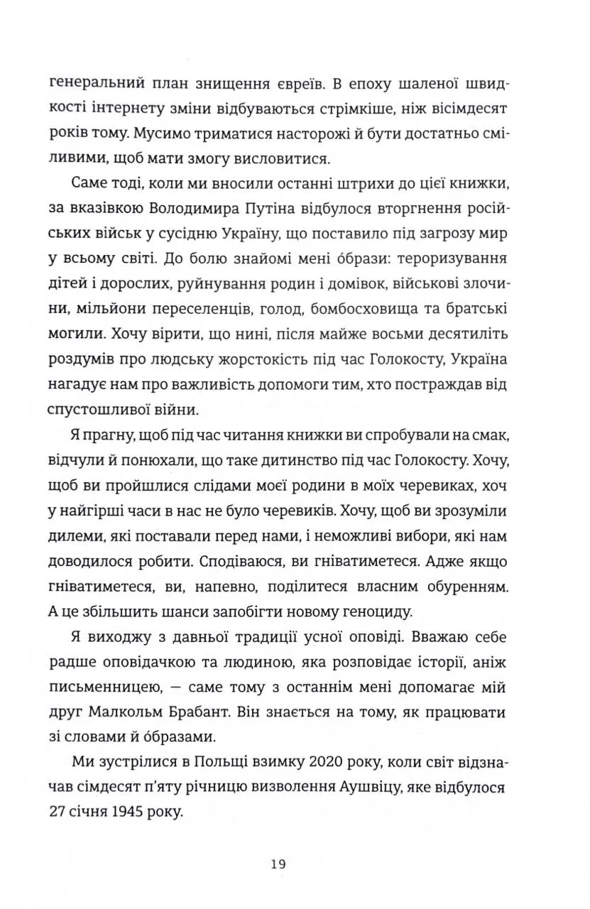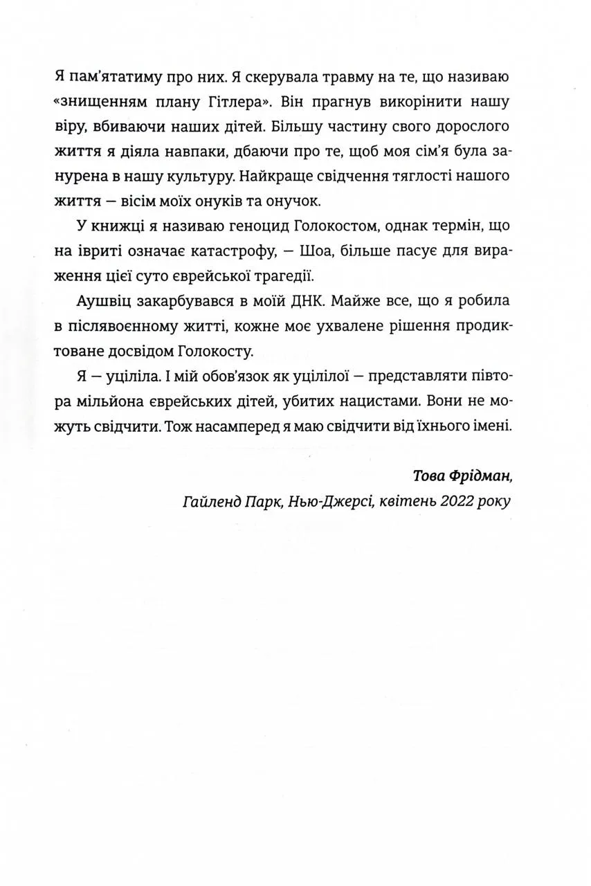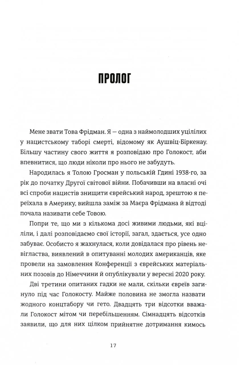 Ця книга — це свідчення Тови Фрідман, однієї з наймолодших в’язнів, які пережили Аушвіц. У співпраці з журналістом Малкольмом Брабантом вона ділиться важкими спогадами про жорстокість табору смерті, розповідає про трагічні компроміси, на які змушені були йти євреї, щоб зберегти життя, і відкриває сімейні таємниці, які проливають світло на темряву того часу. Це історія болю, втрат, незламної волі й джерела надії, яке допомогло її родині вистояти навіть у найжахливіших умовах.