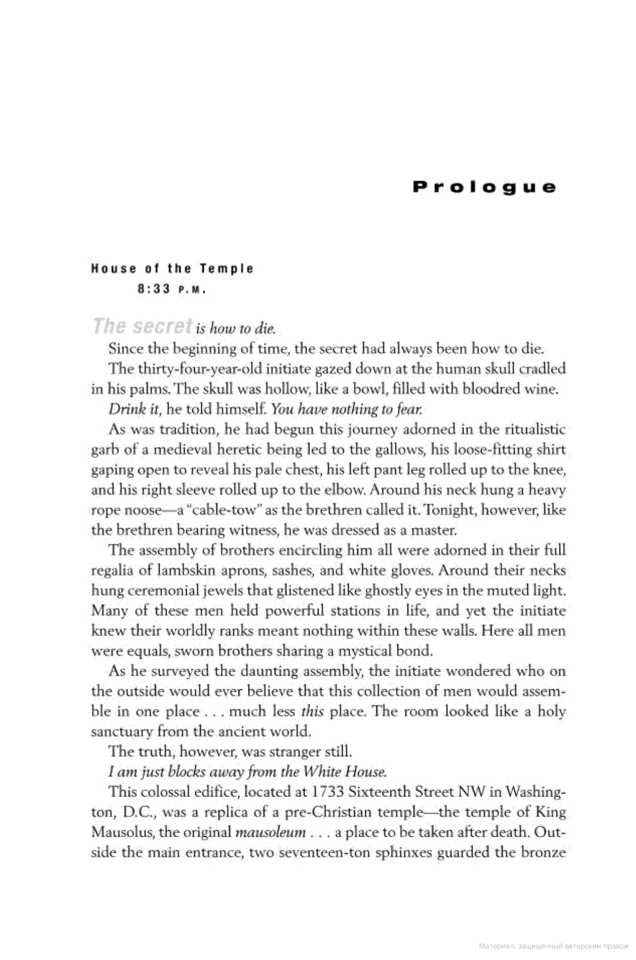 Капітолій, Вашингтон, округ Колумбія: Гарвардський символіст Роберт Ленгдон вважає, що приїхав сюди прочитати лекцію. Він помиляється. За кілька хвилин після його прибуття виявляється шокуючий предмет — моторошне запрошення до стародавнього світу прихованої мудрості.