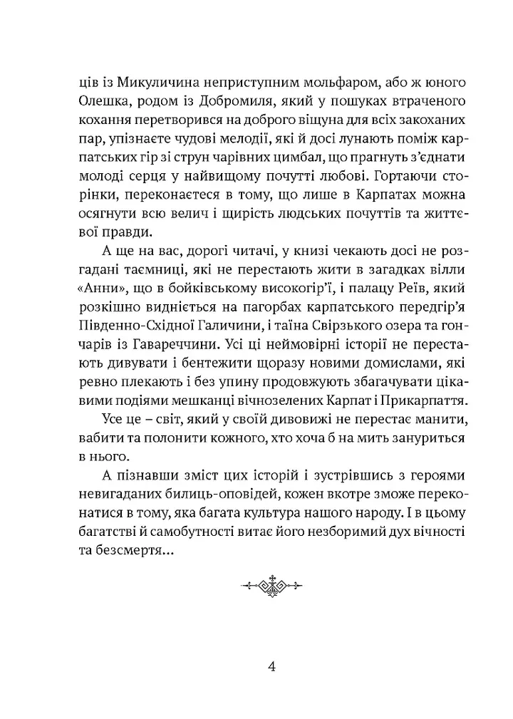 Карпатський край, оспіваний легендами та переказами, оживає у цій книзі як чарівний куточок України, де й досі живуть люди, наділені винятковою силою, красою та мужністю. Ця збірка оповідей відкриває перед читачем світ захопливих історій про кохання, боротьбу за щастя, містичні таємниці та несподівані відкриття.