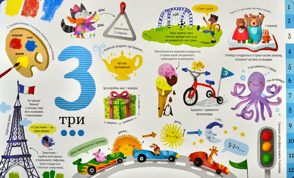 Книга допомагає дітям познайомитися з числами. Скільки днів у році? А секунд у добі? Які числа приносять щастя? І що таке дюжина? Маленькі читачі навчаться рахувати та дізнаються безліч цікавого, мандруючи дивовижним світом чисел! Легко та захопливо — через гру, адже ця книга створена саме для того, щоб навчання лічбі приносило радість. До кожної цифри автори підібрали асоціативний ряд та найцікавіші факти. Саме такий підхід мотивує рухатись далі та заглиблюватися у світ чисел. Адже як показують дослідження, діти найкраще запам’ятовують матеріал, коли навчаються із задоволенням.Книга рекомендована для дітей молодшого шкільного віку та однаково сподобається школярам із різними рівнями підготовки, адже з нею можна як починати вчитися, так і поглиблювати знання з математики.