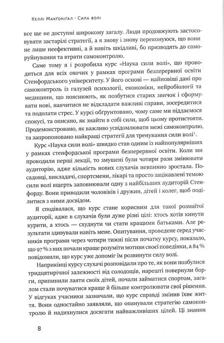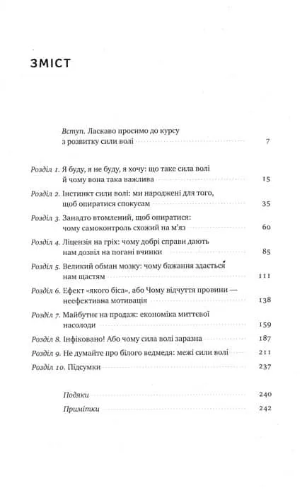Мова, література, математика, фізика, хімія. А що було б, якби у школах та університетах нас вчили розвивати силу волі? Наскільки успішнішими ми могли б стати? Келлі Макґоніґал допомогла тисячам людей змінитися: кинути пити чи курити, пробігти марафон, зайнятися спортом, створити власний бізнес, налагодити стосунки в сім’ї тощо. Свою методику вона узагальнила в цій книжці. Авторка з наукового боку показує, як влаштовано наше мислення, чому ми уникаємо змін і сповна не використовуємо власний потенціал. Але, окрім теорії, Макґоніґал подає безліч фактів і цікавих прикладів. Та найбільша перевага книжки — це вправи. Виявляється, завдяки ним мозок можна натренувати, як м’язи.