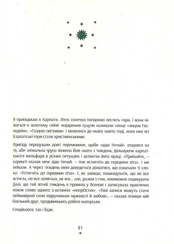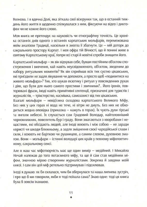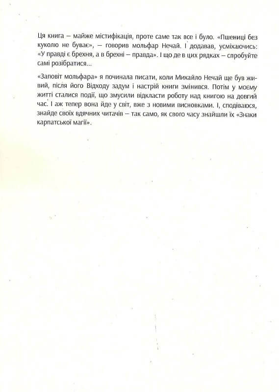 В основу книги лягли розмови зі справжнім “непрОстим” – мольфаром Нечаєм, доповнені роздумами Громовиці Бердник про карпатське мольфарство як складову світової шаманської традиції. Робота над цією книгою поклала початок багатолітній дружбі авторки з Михайлом Нечаєм — карпатським примівником, мольфаром і майстром Традиції. Ілюстрації не менш прекрасні за текст – Анастасія Стефурак вміє приворожити читача настільки, що розумієш: художники – це ті самі мольфари, тільки з пензликом чи планшетом замість чарівної палички.