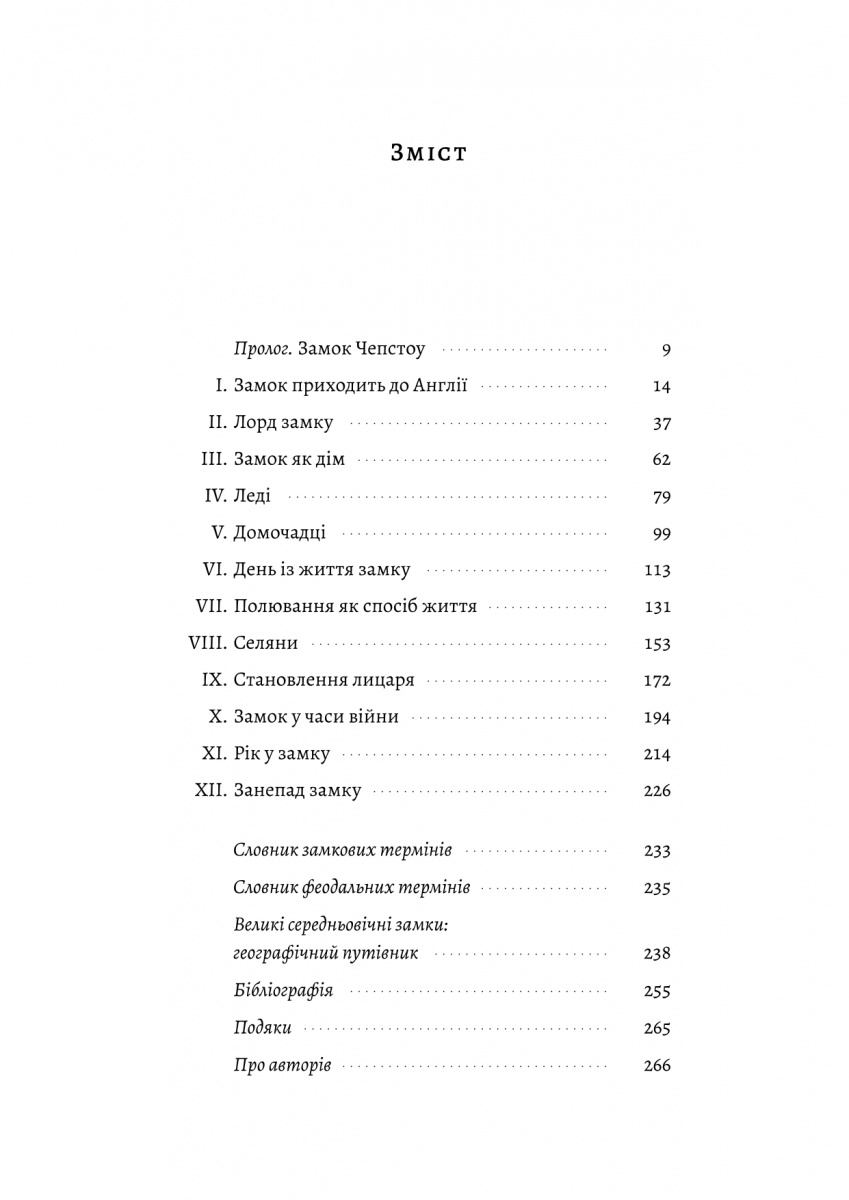 Ця книга розкриває всі аспекти життя середньовічного замку — від звичаїв, що визначали соціальний порядок, до ролі замку як фортеці, яка захищала від ворогів. Відповіді на питання, як влаштовані були замкові стіни, що їли люди, які вбрання носили лицарі й дам, а також які обряди і ритуали проводилися, стануть незамінним ресурсом для тих, хто цікавиться історією, літературою чи створенням історичних світів.
