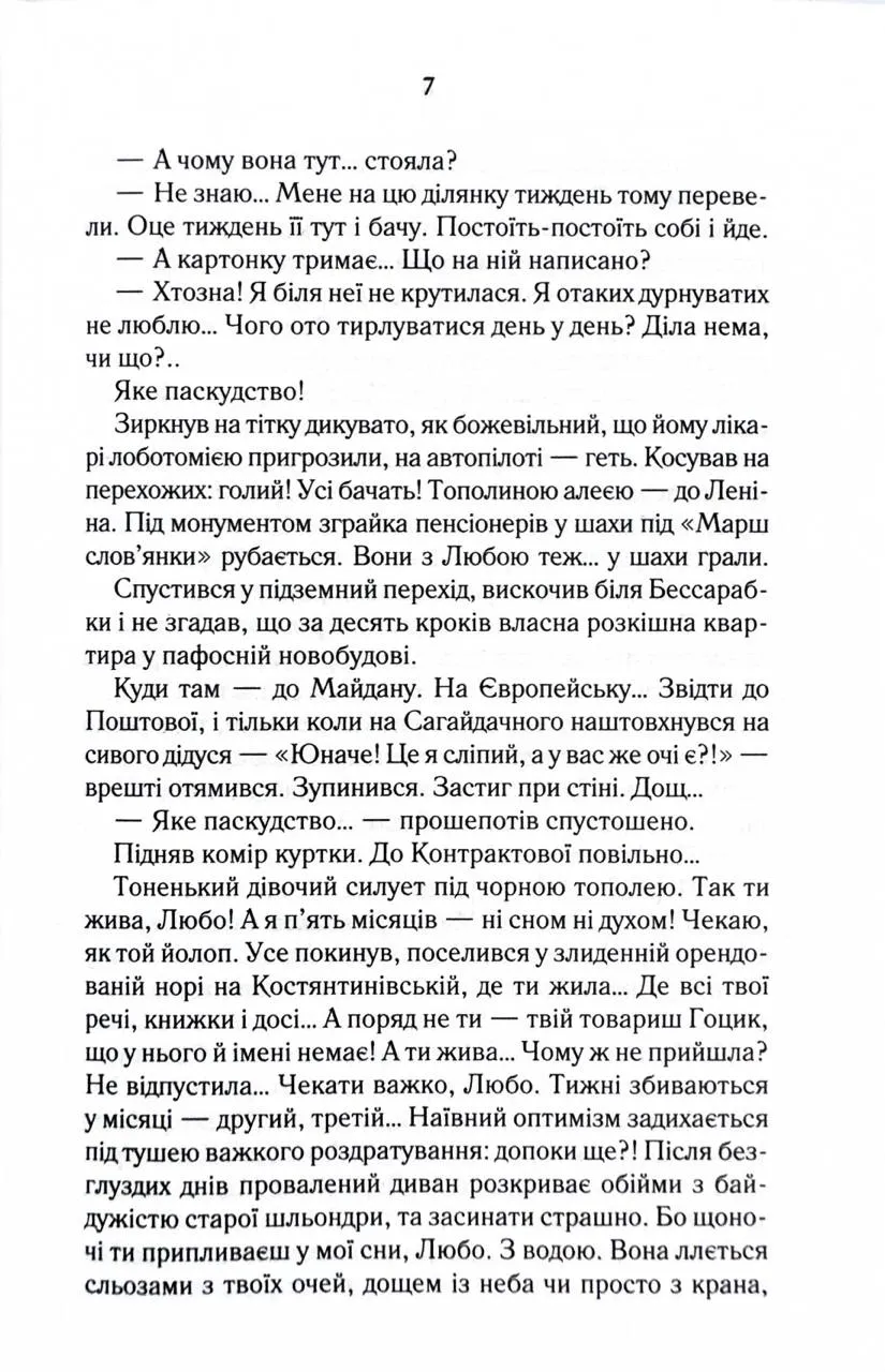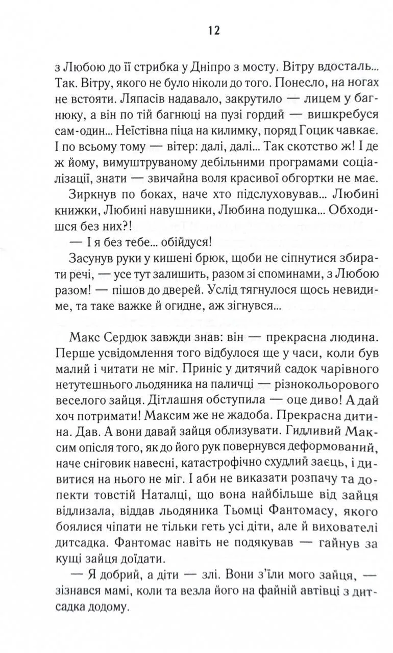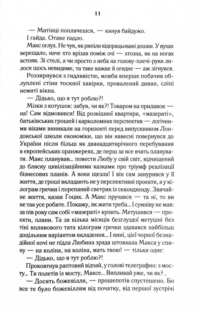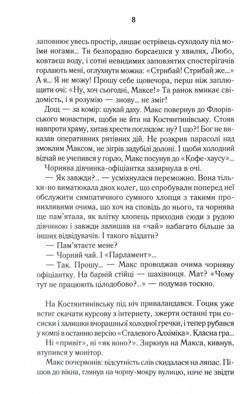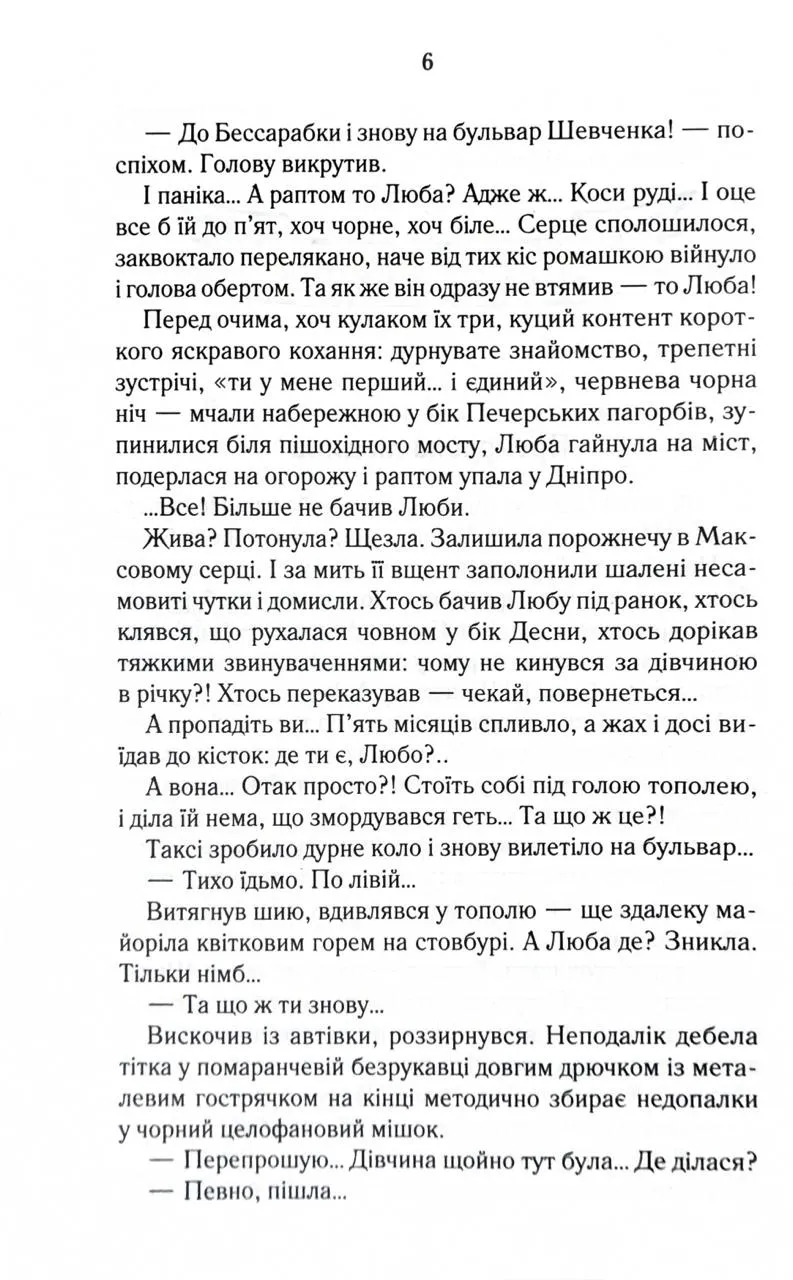 Перевидання в оновленому оформленні Пів року незалежності - на більше Макса не вистачило. Заради чого він б’ється головою у глуху стіну, порвав із батьками, злидарює? Його дівчина втекла, не підтримавши відчайдушних спроб стати неймовірним чоловіком… Прийняти фінансову допомогу рідних і гидувати нею - оце по-Максовому! Тож одного не зовсім звичайного дощового вечора Макс вирішив зникнути. Назавжди. Колись він не ризикнув кинутися у Дніпро, щоб урятувати своє кохання, зате нині готовий шубовснути у воду - аби випірнути згодом десь далеко зовсім новим, очищеним…