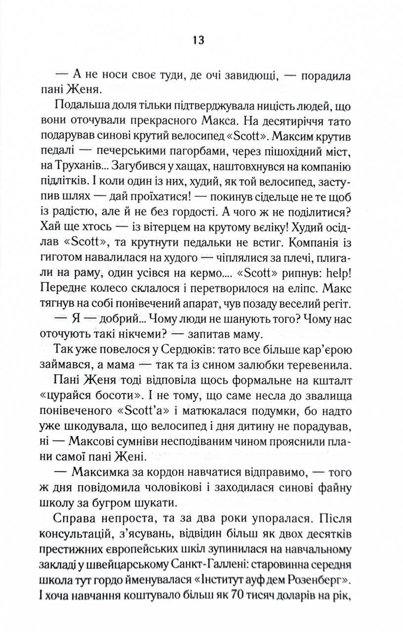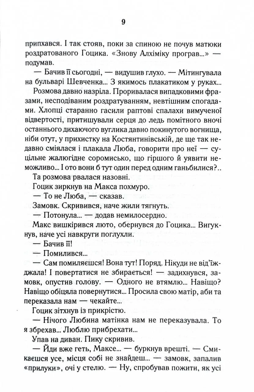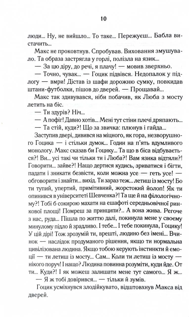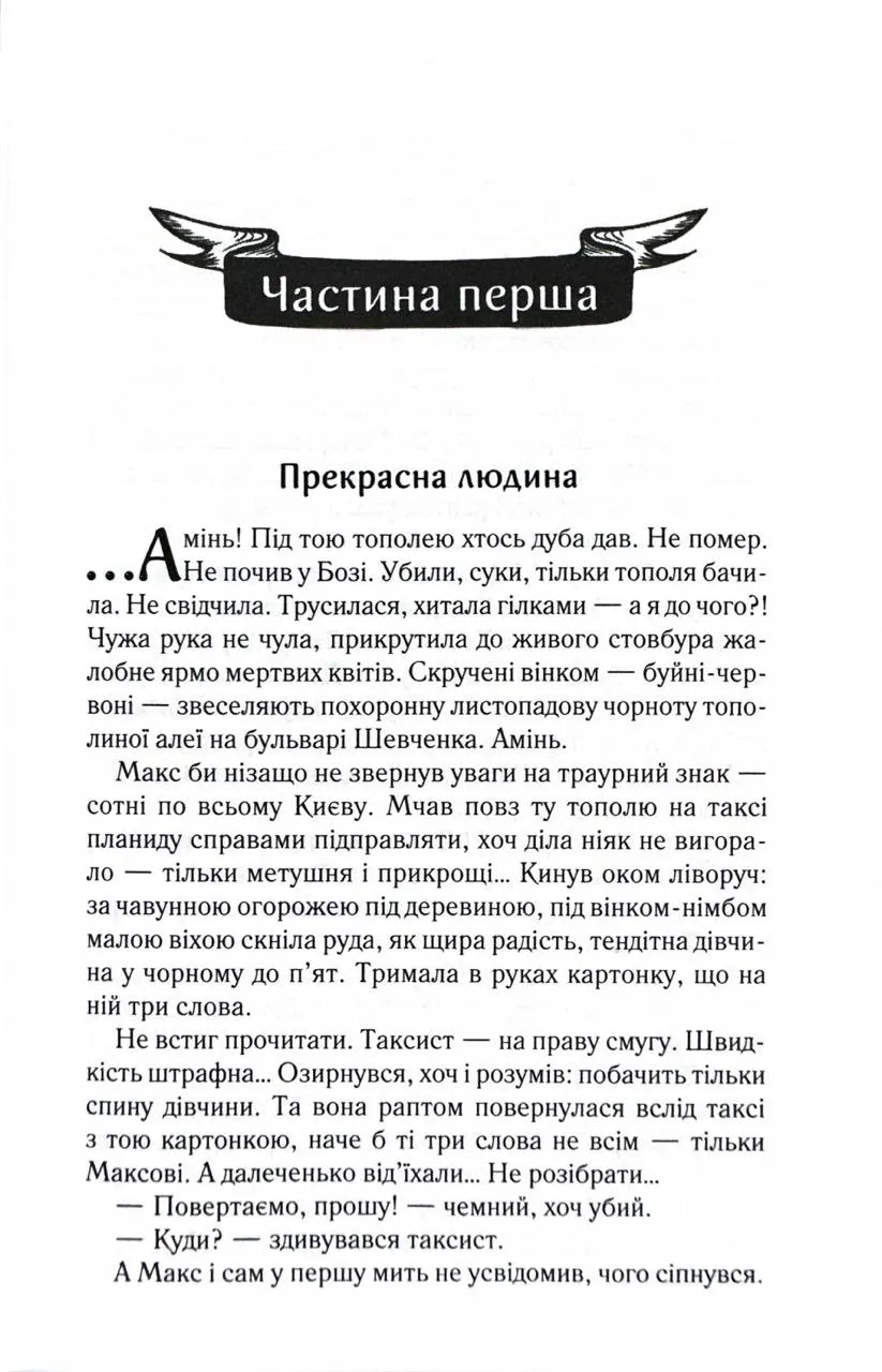 Перевидання в оновленому оформленні Пів року незалежності - на більше Макса не вистачило. Заради чого він б’ється головою у глуху стіну, порвав із батьками, злидарює? Його дівчина втекла, не підтримавши відчайдушних спроб стати неймовірним чоловіком… Прийняти фінансову допомогу рідних і гидувати нею - оце по-Максовому! Тож одного не зовсім звичайного дощового вечора Макс вирішив зникнути. Назавжди. Колись він не ризикнув кинутися у Дніпро, щоб урятувати своє кохання, зате нині готовий шубовснути у воду - аби випірнути згодом десь далеко зовсім новим, очищеним…