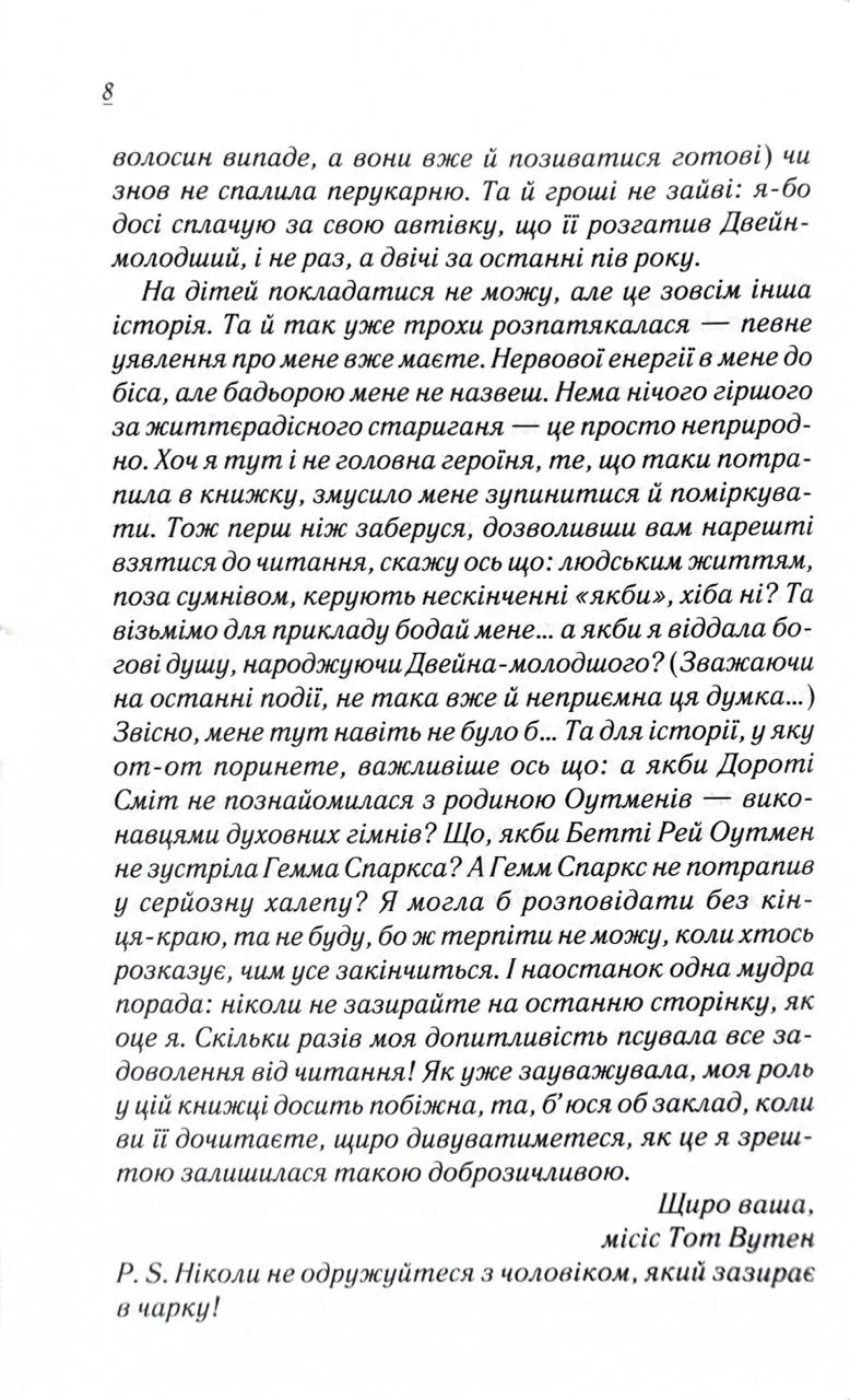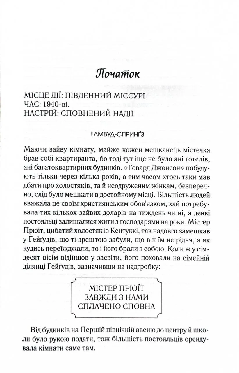 • Бестселер The New York Times • Від авторки затишної історії «Смажені зелені помідори в кафе «Зупинка» Елмвуд-Спринґз - містечко, де всі всіх знають і де вирує життя - щасливе й трагічне, стабільне й непередбачуване… Тут кожен мешканець має свою родзинку, а зазвичай і не одну. Харизматичний Гемм Спаркс, занадто амбітний, щоб займатися продажем тракторів, балотується в губернатори, а потім у президенти. А дві жінки, які його кохають, із подивом спостерігають, що з того вийде. Беатріс Вудс, «маленька сліпа співоча пташка», погоджується на неочікувану пропозицію. Життєрадісна тітка Елнер, як і годиться літній жінці, бере під опіку ціле сімейство рудих котів. А Сусідка Дороті у щоденних радіопередачах повідомляє про них та інших мешканців містечка на весь світ! Бо кожному з Елмвуд-Спринґза є що вам розказати, чим підтримати в похмурий день і як надихнути радіти кожній миті життя!