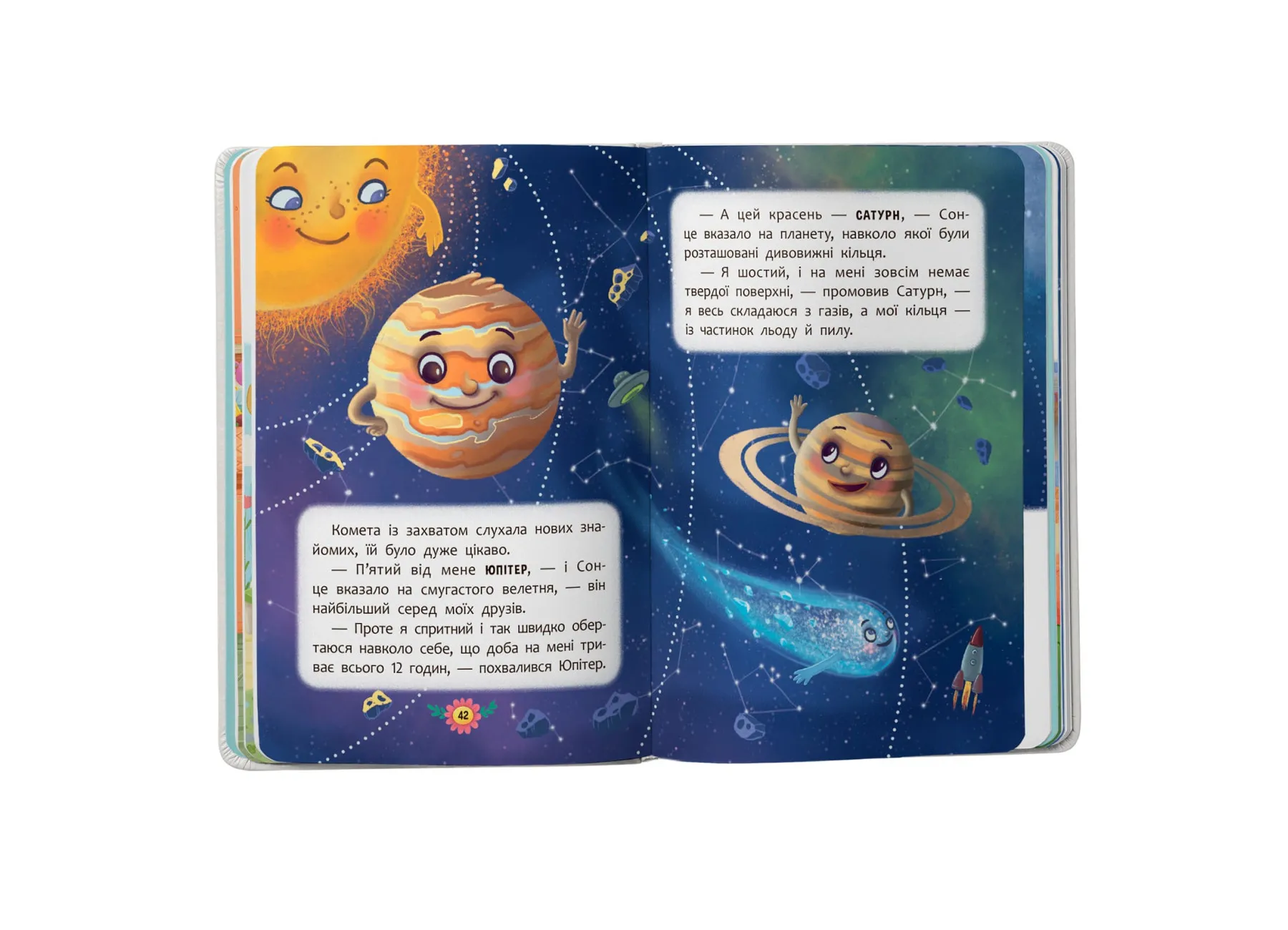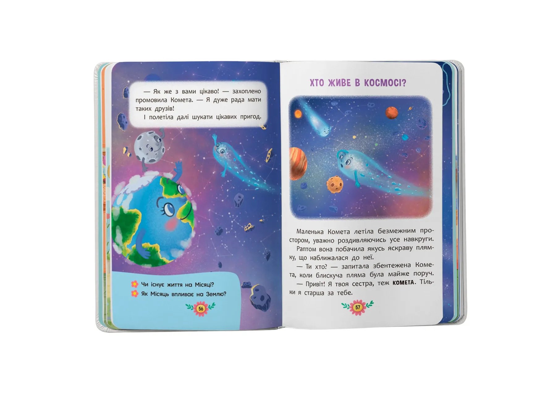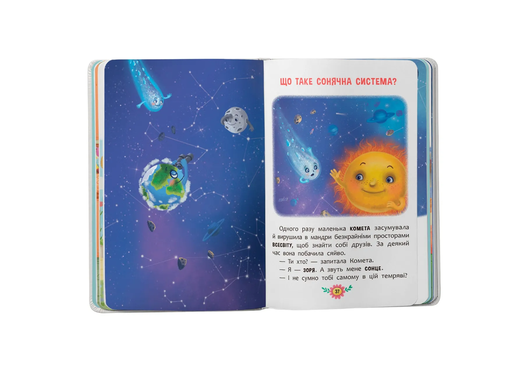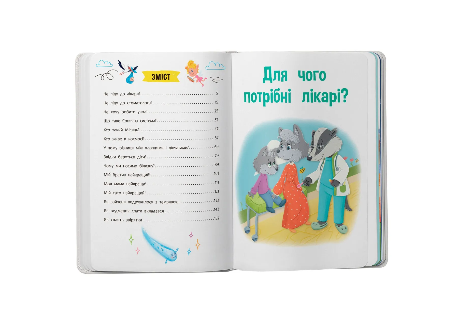 Книжка містить 15 легких і зрозумілих історій, які пояснюють складні речі простою мовою. Малюк дізнається, що таке космос і його таємниці, відкриє відповідь на питання «Звідки я взявся?», зрозуміє важливість лікарів та подолає страх перед ними. Казки допоможуть дитині усвідомити цінність родинної любові, навчать, навіщо спати вночі, і розкажуть, як це роблять різні звірята.