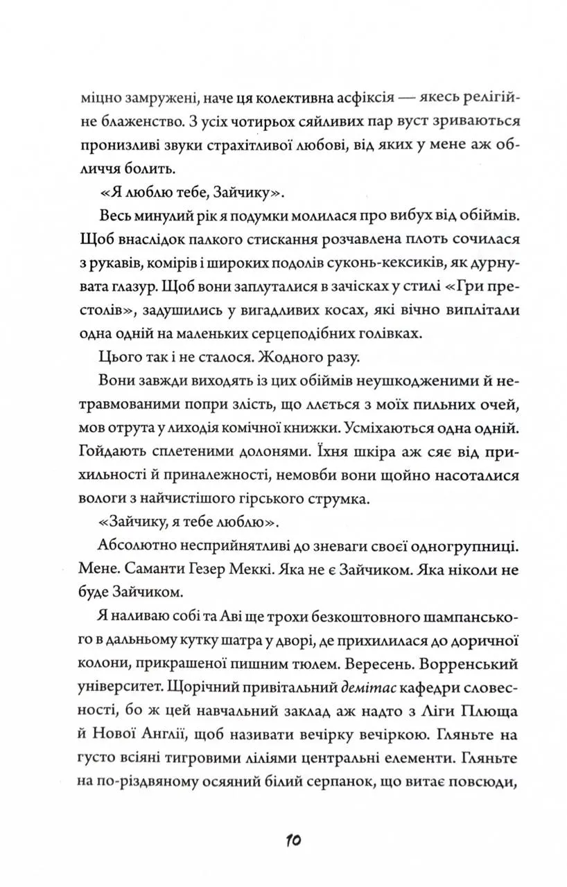 Головна героїня книги Саманта — стипендіатка престижної магістерської програми з літератури у Ворренському університеті. Її одногрупниці — четверо багатих дівчат, які називають одна одну "Зайчиками" та живуть у своєму нереальному, відокремленому світі. Спостерігаючи за ними, Саманта почувається аутсайдеркою, поки не отримує дивне запрошення на "легендарний" Салон непристойностей.