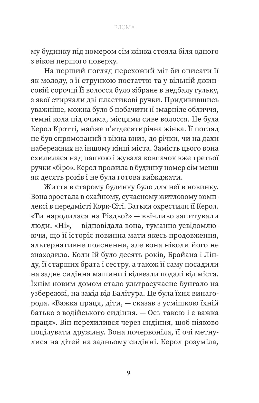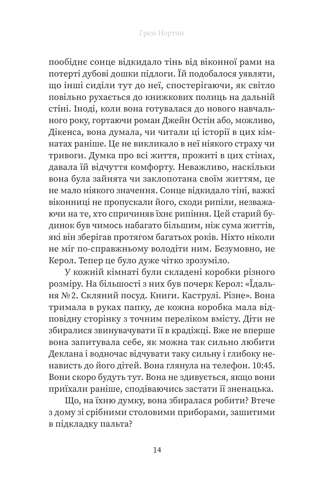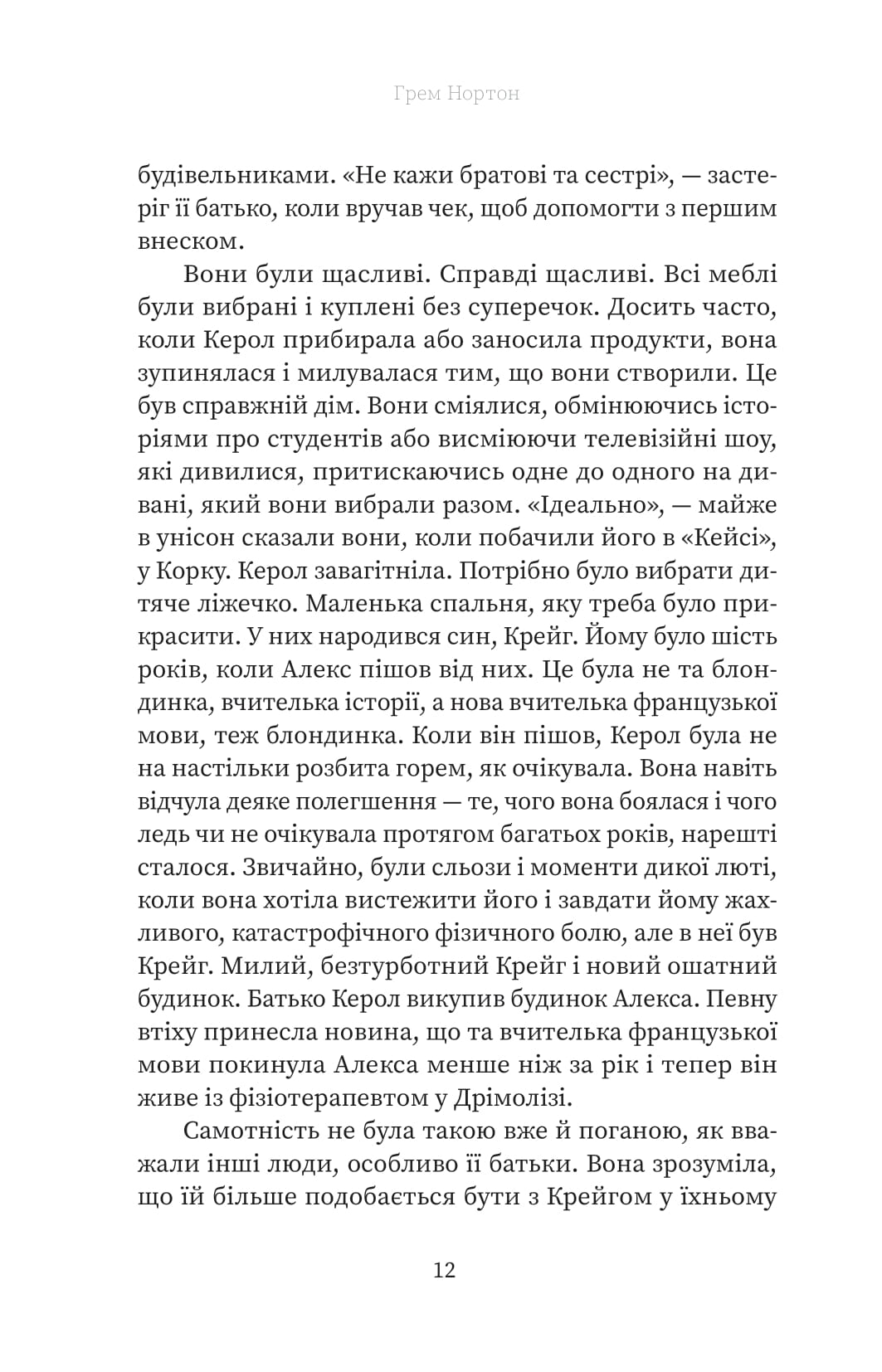 Роман автора міжнародних бестселерів і ведучого «Шоу Грема Нортона» — це історія про сімейну драму, поєднання літературної фантастики та містики. Дія роману розгортається у вигаданому ірландському містечку Балітур. Вчителька англійської мови Керол Кротті втрачає чоловіка, і минають роки, перш ніж вона знову закохується. Ніхто не розуміє, що вона бачить у Деклані Баррі, літньому чоловікові, дружина якого зникла багато років тому. Коли пізніше у Деклана діагностують ранню стадію хвороби Альцгеймера, його діти, Кілліан і Саллі, переселяють його до будинку для літніх людей. Керол змушена виїхати з дому, у якому вони жили разом з Декланом. Згодом Керол дізнається правду про зниклу дружину Деклана. Взаємини героїв, спогади і реалії водночас відкривають таємницю вбивства, яку довго приховували… Загадковий і непередбачуваний сюжет роману нікого не залишить байдужим.