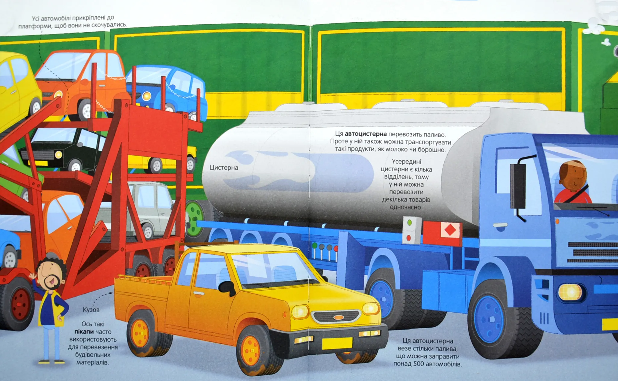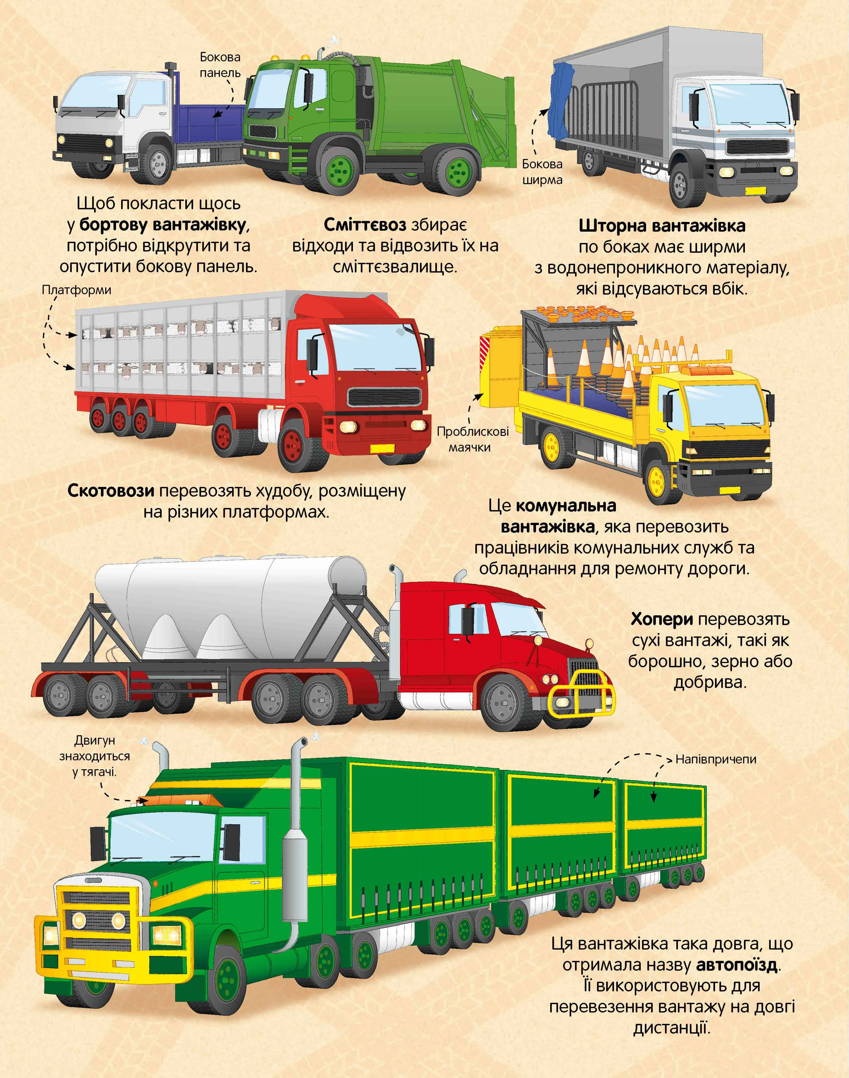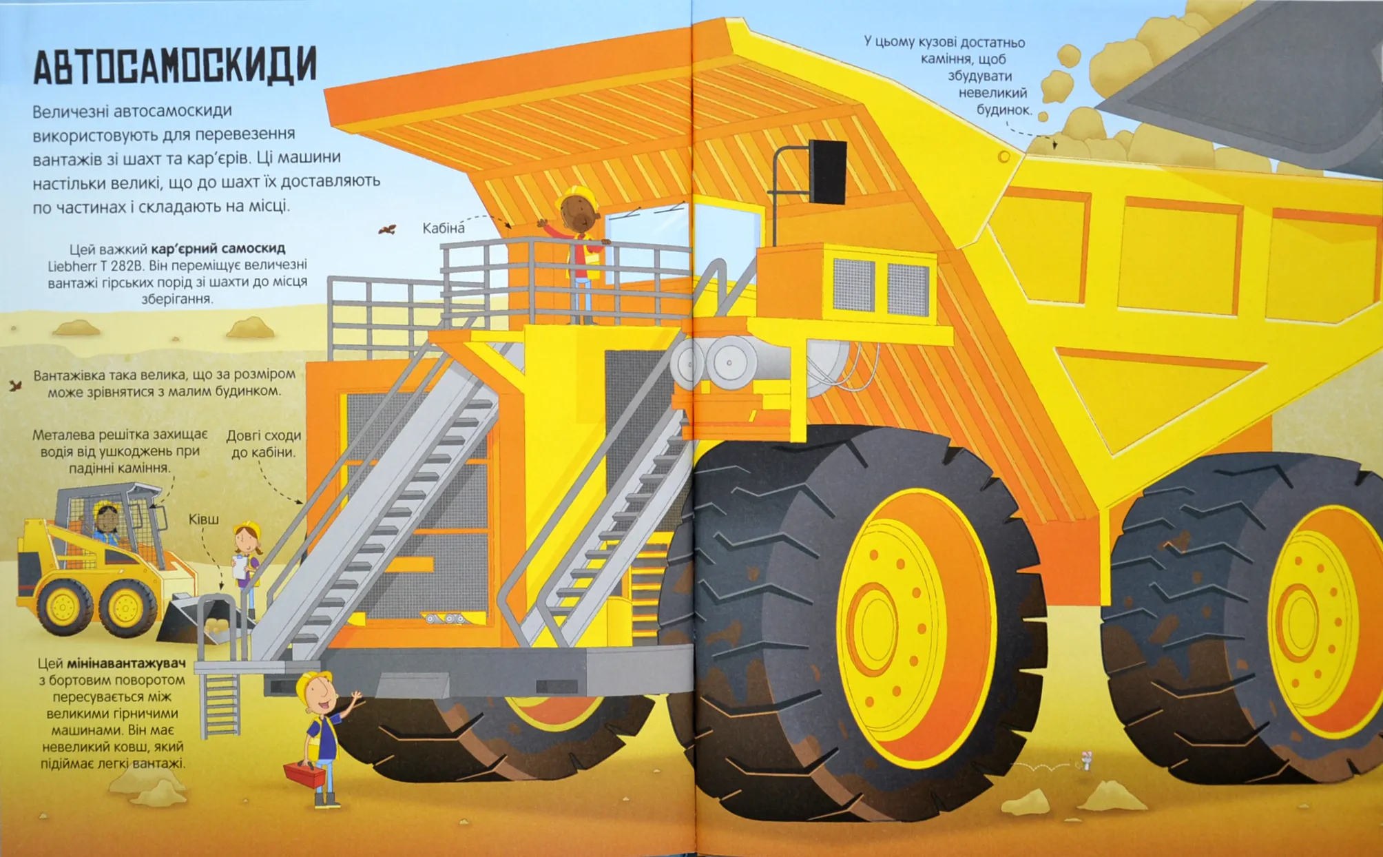 Відкривайте гігантскі розгортки та дізнавайтесь усе про найбільші, найвищі та найпотужніші вантажівки у світі: від величезного сміттєвоза до пересувних баштових кранів.