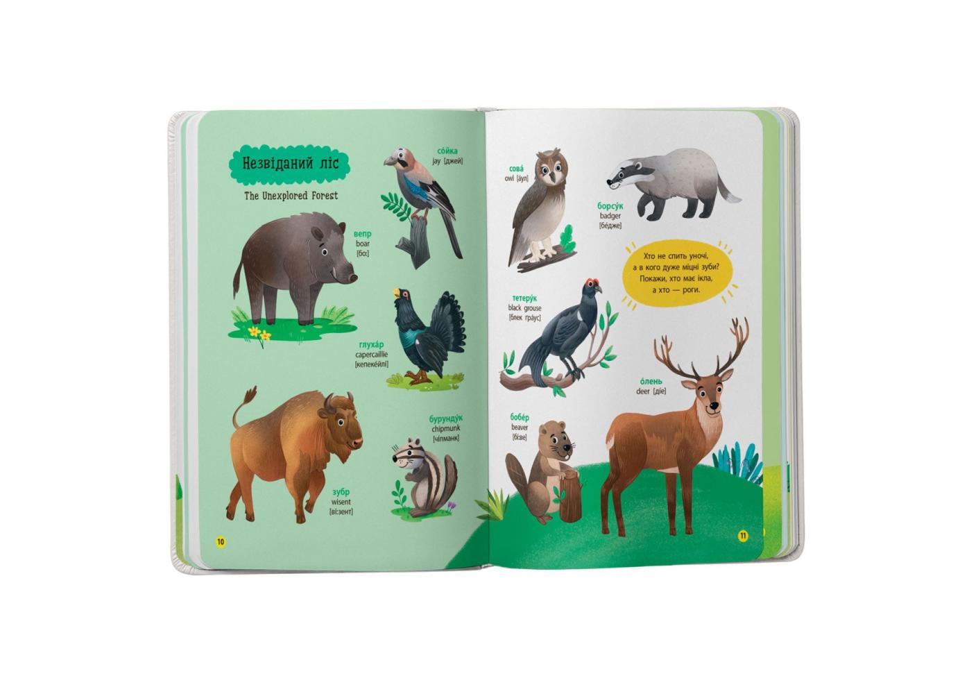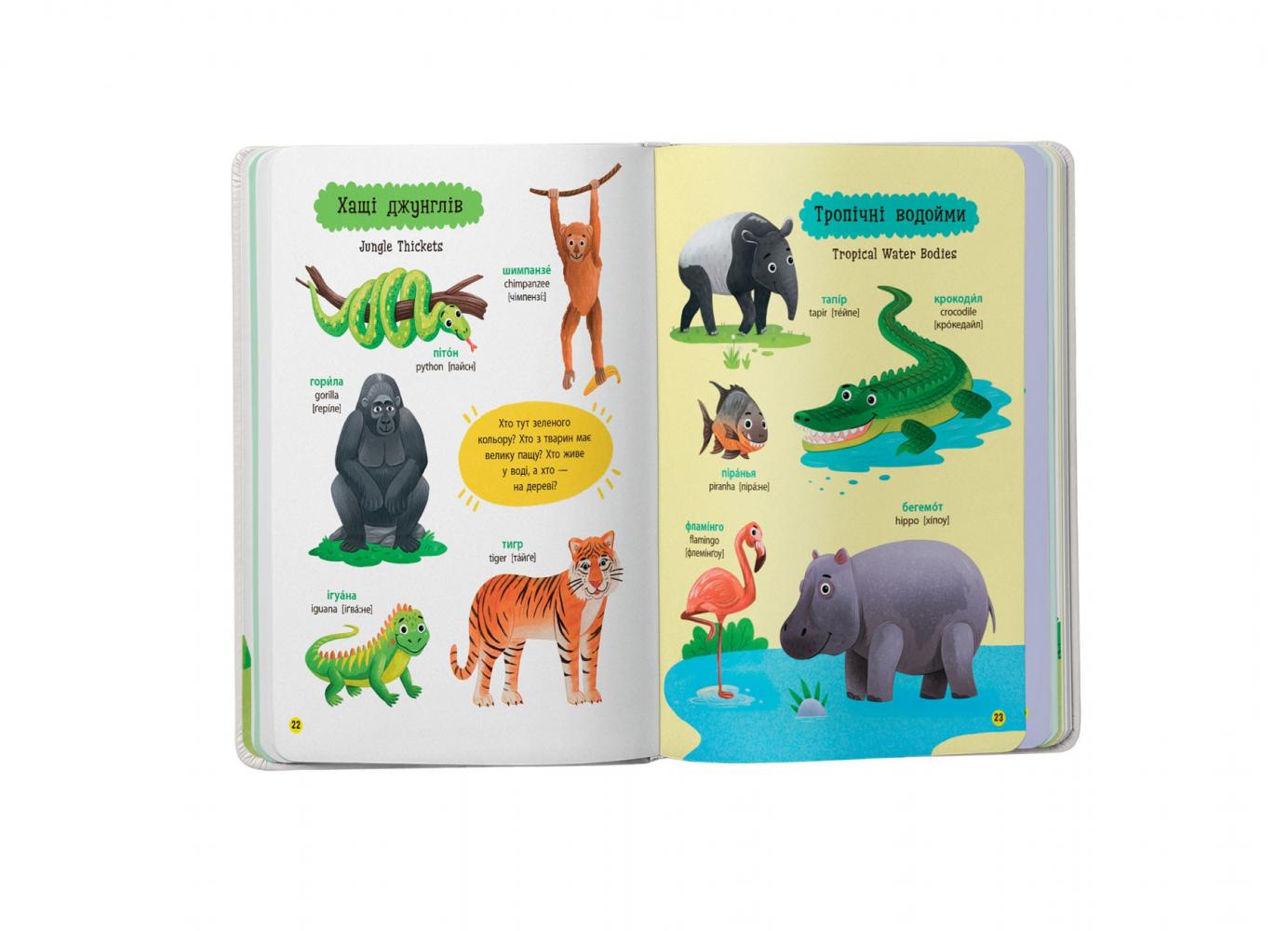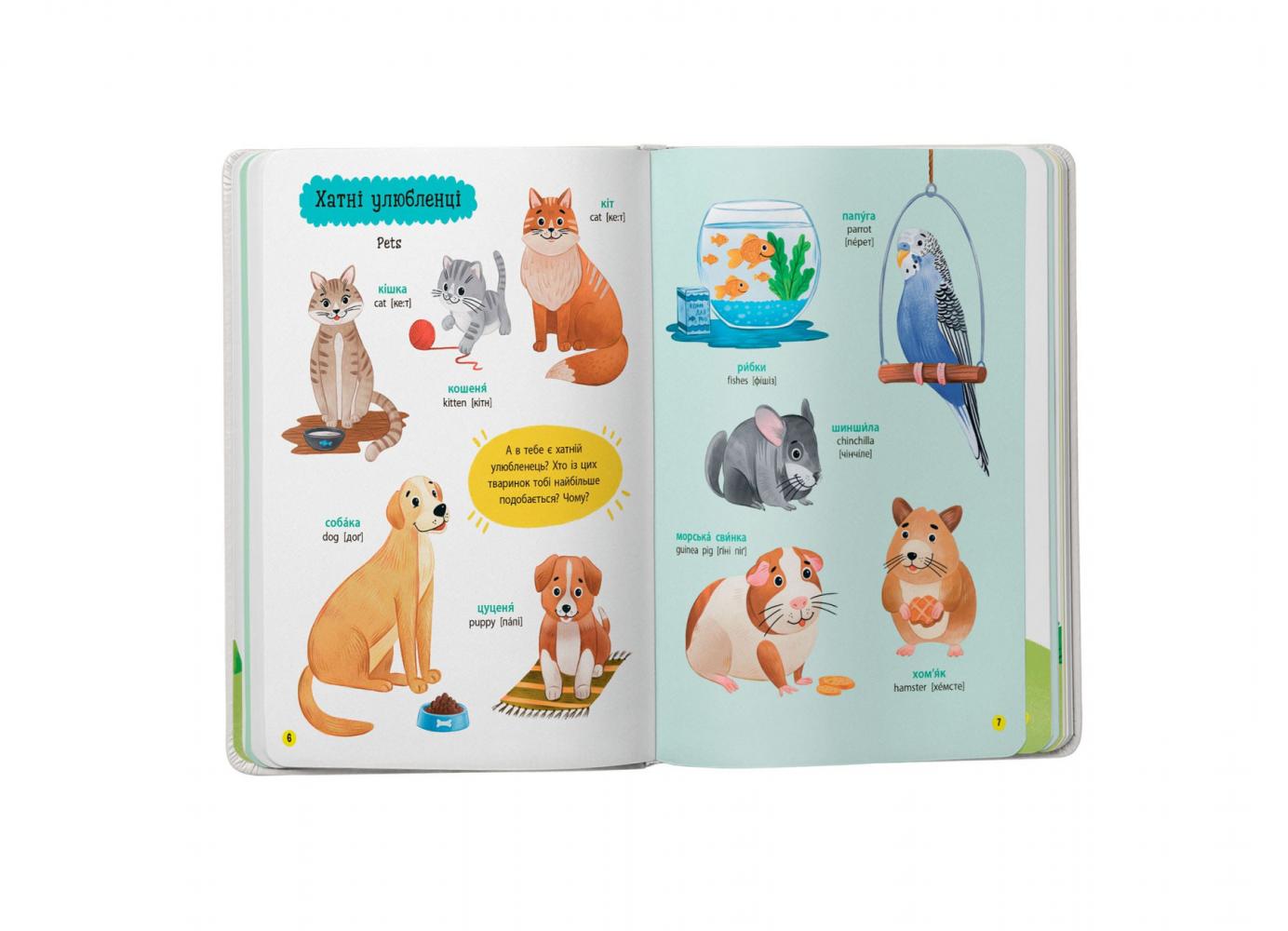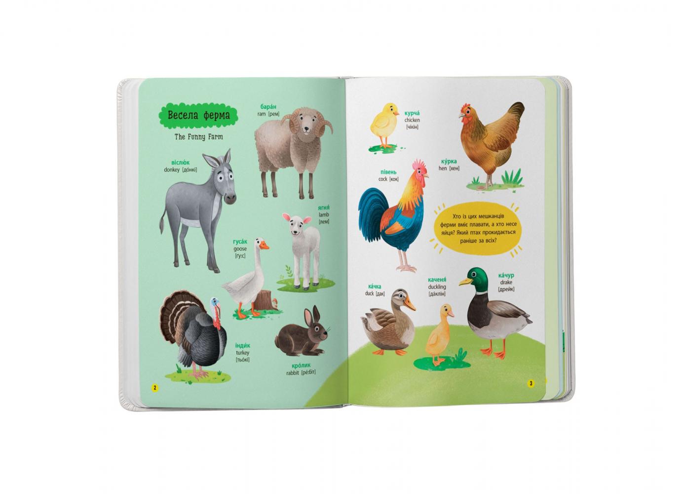 Ця книжка допоможе дитині в ігровій формі засвоїти нові слова, навчитися чітко та правильно їх вимовляти, а також сприятиме розвитку логічного мислення та вивченню навколишнього світу. На кожному розвороті малюк бачитиме великі кольорові малюнки, запам’ятовуватиме нові слова, відшукуватиме задані предмети, відповідатиме на запитання. Підписи в книжці подано двома мовами, що зробить вивчення англійської легким і веселим навіть для найменших.Видання призначене для читання батьками дітям віком від двох років.