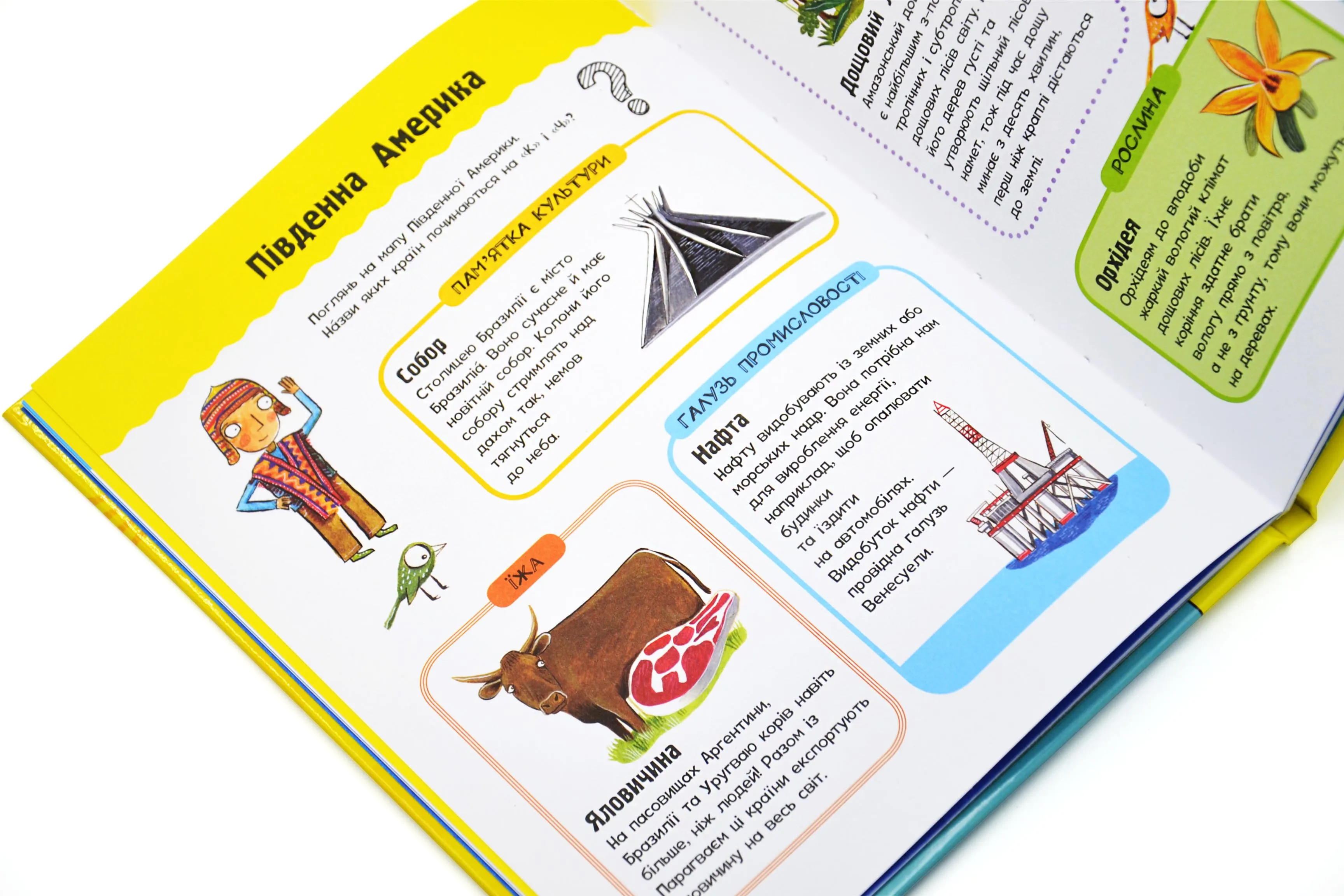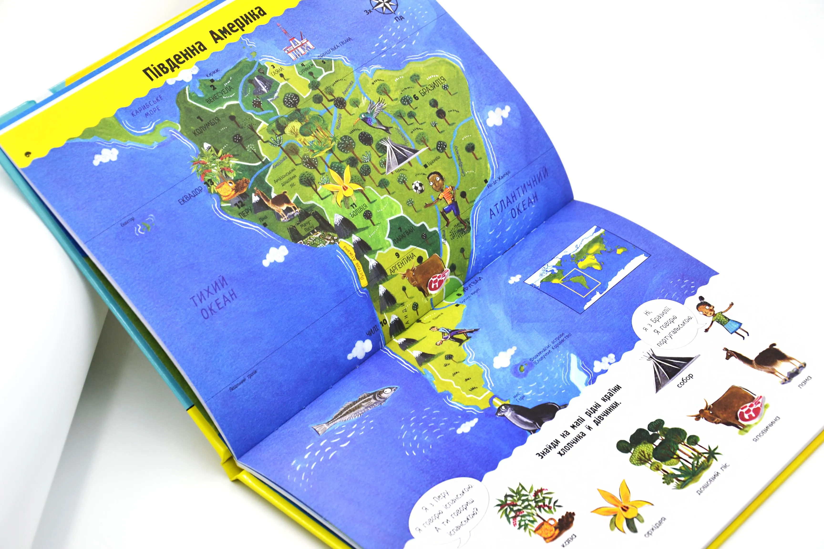 Ця книга стане першим кроком дитини у світ географії. Атлас допомагає легко та цікаво пізнавати нашу планету, знайомлячи малечу з її материками, океанами та країнами.