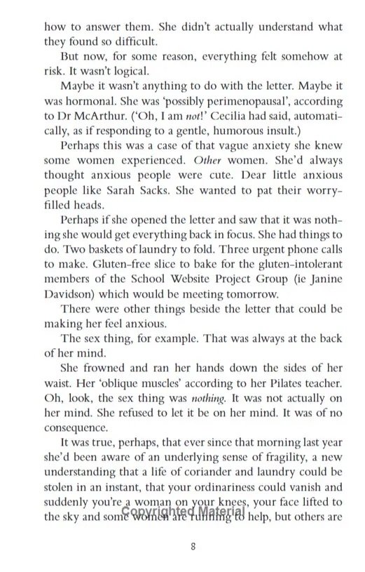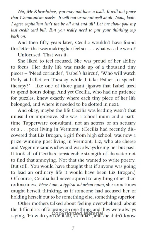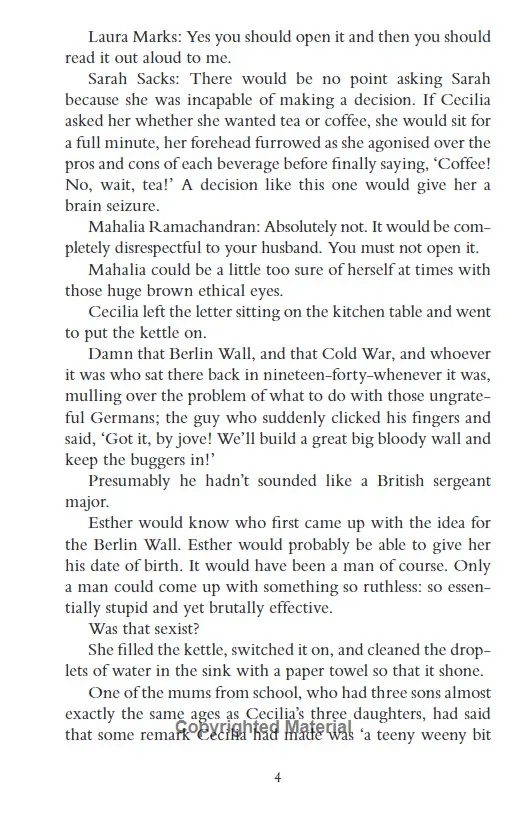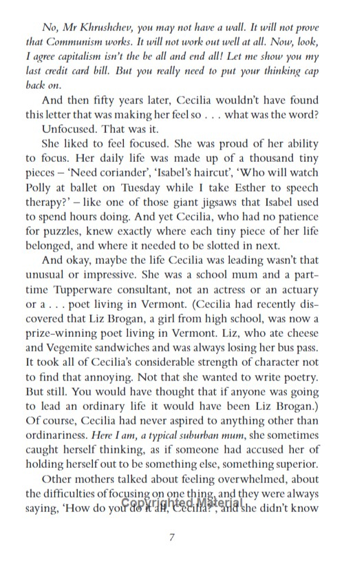 Cecilia Fitzpatrick thought she knew her husband.Until she finds an envelope with 'to be opened in the event of my death' written in his hand, and learns of his devastating mistake.Now Cecilia faces a terrible choice. Because revealing her husband's secret will hurt those she loves the most.But could the consequences of staying silent be worse?