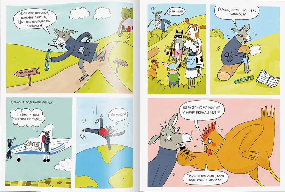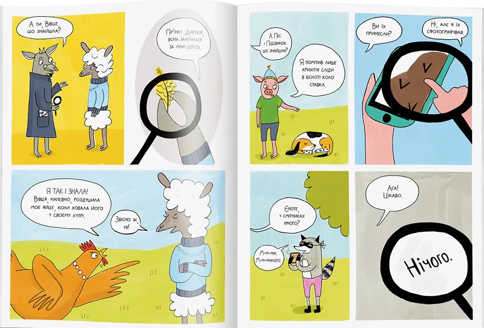 На фермі повсякчас трапляються якісь дивні злочини, але не біда, коли є Інспектор Цап, який розкриє будь-яку справу. Ну майже розкриє... От у курки зникло яйце і вона підняла ґвалт, під підозрою опинився кожен житель ферми. Але кому ж насправді потрібно було те яйце? Кумедний комікс серії "Злочини на фермі" для молодшого шкільного віку.