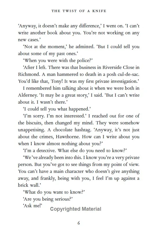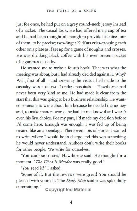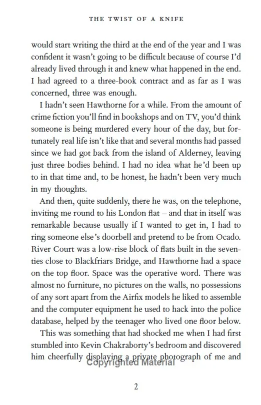 'Our deal is over.'This is what reluctant author Anthony Horowitz tells ex-detective Daniel Hawthorne in an awkward encounter. The truth is that Anthony has other things on his mind.His new play 'Mindgame' is about to open at London's Vaudeville theatre, and on opening night, Sunday Times critic Harriet Throsby gives the play a savage review.The next morning she is found dead, stabbed in the heart with an ornamental dagger that has only one set of finger prints on it. Anthony's.Anthony is arrested, charged with Throsby's murder, and thrown into prison.Alone and increasingly desperate, he realises only one man can help him.But will Hawthorne take his call?