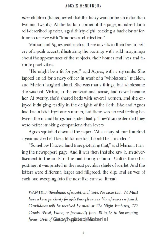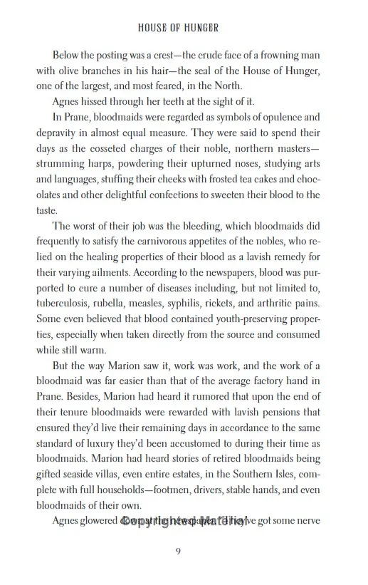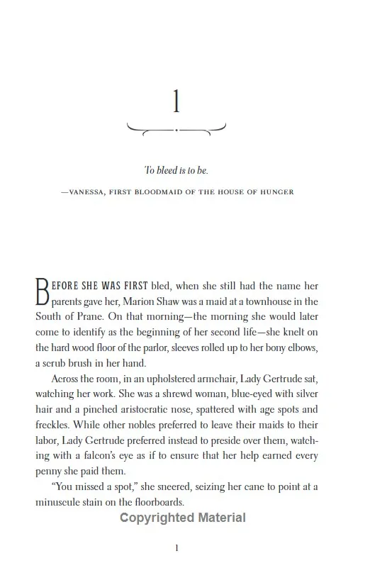 Marion Shaw has been raised in the slums, where want and deprivation are all she knows. Despite longing to leave the city and its miseries, she has no real hope of escape until the day she spots a strange advertisement in the newspaper, seeking a 'bloodmaid'.Though she knows little about the far north - where wealthy nobles live in luxury and drink the blood of those in their service - Marion applies to the position. In a matter of days, she finds herself at the notorious House of Hunger. There, Marion is swept into a world of dark debauchery - and there, at the centre of it all is her.Her name is Countess Lisavet. Loved and feared in equal measure, she presides over this hedonistic court. And she takes a special interest in Marion. Lisavet is magnetic, charismatic, seductive - and Marion is eager to please her new mistress. But when her fellow bloodmaids begin to go missing in the night, Marion is thrust into a vicious game of cat and mouse. She'll need to learn the rules of her new home - and fast - or its halls will soon become her grave.