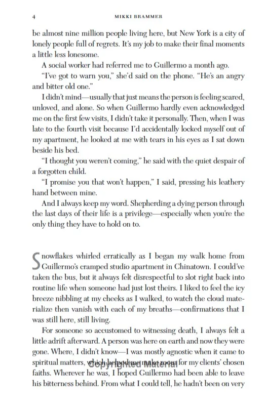 Clover Brooks has forgotten how to live.It might be because she spends her time caring for people in their final days, working as a death doula in New York City.Or it might be because she has a regret of her own - one she can't bring herself to let go of.But then she meets Claudia: a feisty old woman who has one last wish . . .As Clover begins a new adventure, will she remember how to live her own big, beautiful life?