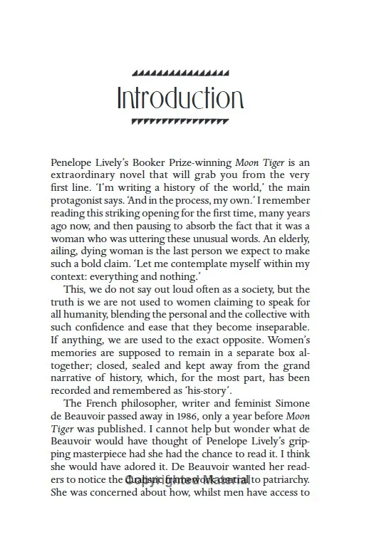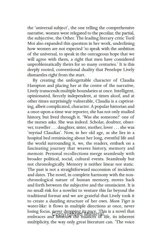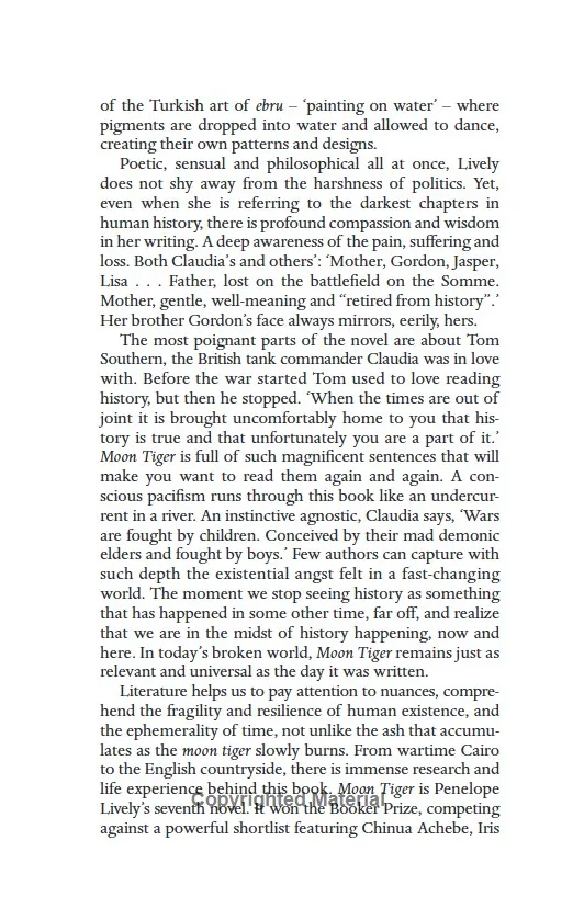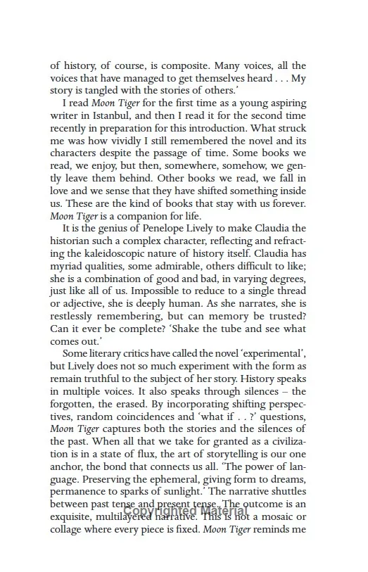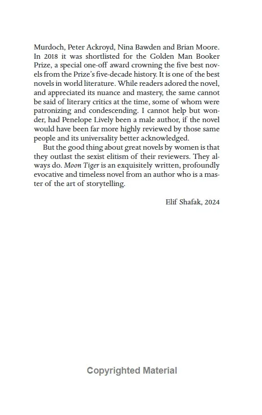 Claudia Hampton - beautiful, famous, independent, dying.But she remains defiant to the last, telling her nurses that she will write a 'history of the world . . . and in the process, my own'. And it is her story from a childhood just after the First World War through the Second and beyond. But Claudia's life is entwined with others and she must allow those who knew her, loved her, the chance to speak, to put across their point of view. There is Gordon, brother and adversary; Jasper, her untrustworthy lover and father of Lisa, her cool conventional daughter; and then there is Tom, her one great love, found and lost in wartime Egypt.The masterpiece of one of the century's finest novelists, Moon Tiger is a haunting, evocative and dazzlingly original story of loss and desire - now with a new introduction by Elif Shafak.