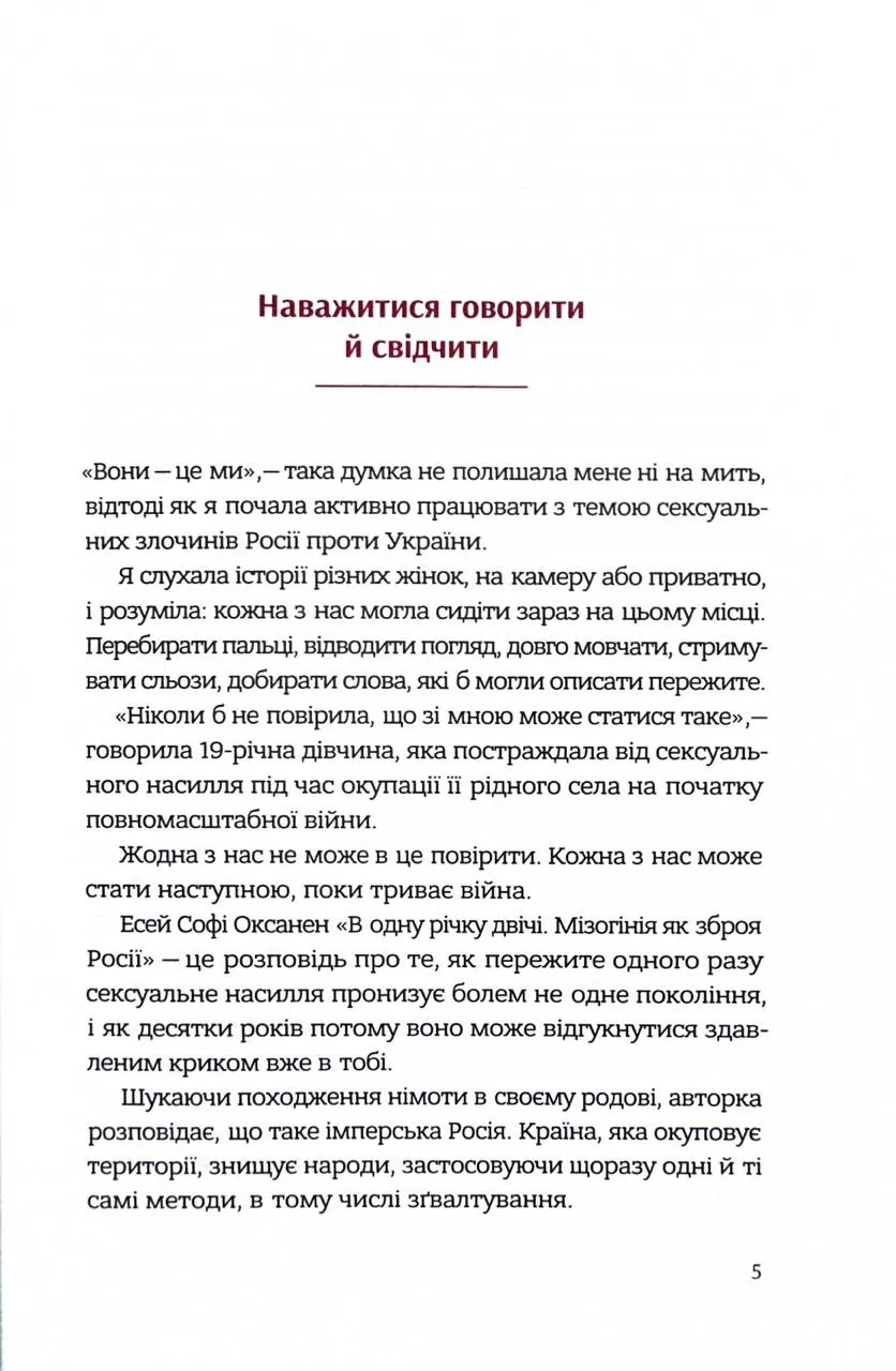 «В одну річку двічі» — новий есей відомої фінської письменниці Софі Оксанен. У своїй книзі авторка аналізує мізогінію як інструмент державної політики Росії. Це глибоке дослідження насильства, страху та безкарності, що тривають поколіннями.