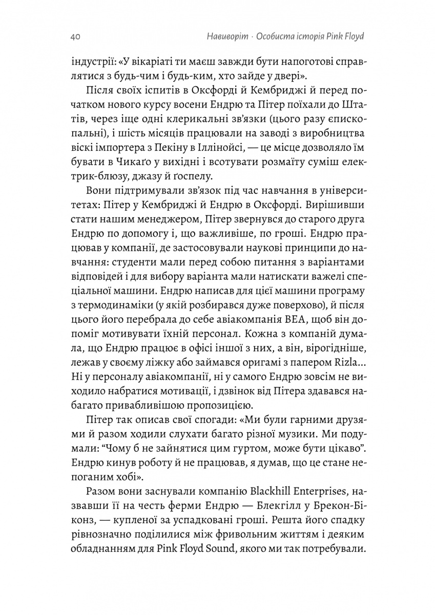 Pink Floyd — вичерпна історія одного з найвидатніших гуртів світу від учасника-засновника Ніка Мейсона. «Навиворіт» — це не просто історія гурту, який став музичною легендою. Це емоційна сповідь з перших вуст — шлях музичного мистецтва крізь безповоротні втрати, нові релізи і розколи, до впливу на успіх цифрових технологій і соціальних мереж.