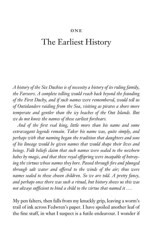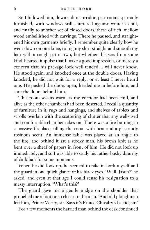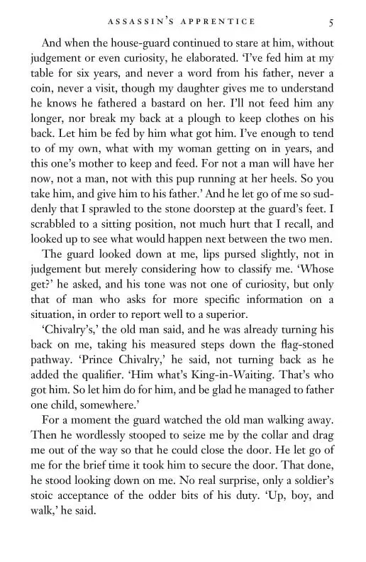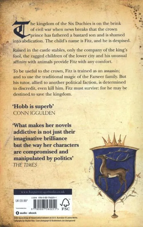 The kingdom of the Six Duchies is on the brink of civil war when news breaks that the crown prince has fathered a bastard son and is shamed into abdication. The child's name is Fitz, and he is despised.