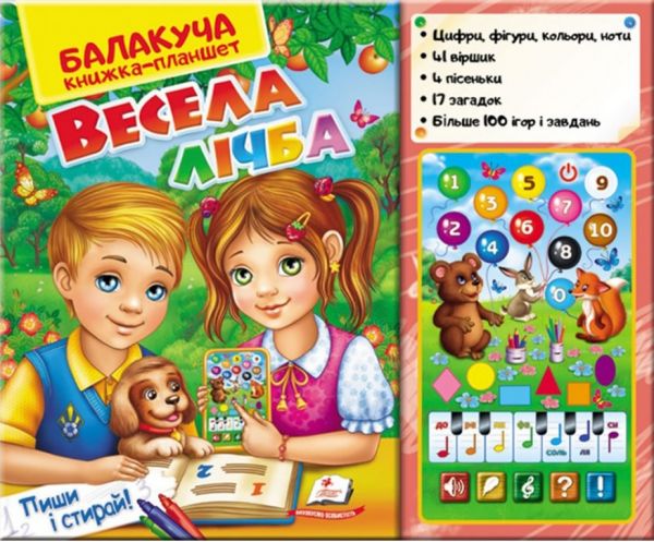 Музична книга зі звуковим планшетом Веселий рахунок: - цифри, фігури, кольори та ноти; - 41 вірш; - 4 пісеньки; - 17 загадок; - понад 100 ігор та завдань! Говоряча книга з планшетом Веселий рахунок допоможе малюкові: - навчитися писати цифри; - Познайомитися з нотами; - Малювати фігури. Обкладинка: Тверда Мова: Українська Серія: книжка-планшет, що говорить Вік: 2+