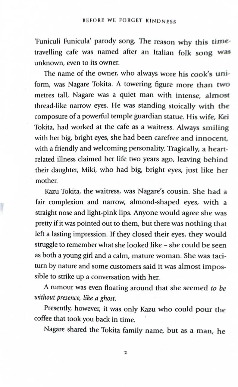 The million-copy bestselling seriesIn the fifth book in the sensational Before the Coffee Gets Cold series translated from Japanese, the mysterious Tokyo café where customers arrive hoping to travel back in time welcomes four new guests:- The father who could not allow his daughter to get married- A woman who couldn't give Valentine's Day chocolates to her loved one- A boy who wants to show his smile to his divorced parents- A wife holding a child with no name . . .They must follow the café's strict rules, however, and come back to the present before their coffee goes cold.Another moving and heartwarming tale from Toshikazu Kawaguchi, in Before We Forget Kindness our new visitors wish to go back into their past to find closure and comfort so they can embark on a beautiful future.Catch up on the rest of the series with Before the Coffee Gets Cold, Tales from the Cafe, Before Your Memory Fades and Before We Say Goodbye.