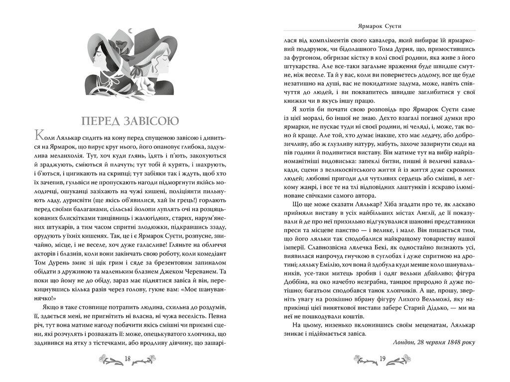 «Ярмарок Суєти. Роман без героя» Вільяма Мейкпіса Текерея — сатиричний роман, написаний у 1848 році, який уже майже два століття читають і перечитують у всьому світі. Чим же він так вабить? Чому такий відомий, та однаково незвіданий? І чому одні твори стають світовою класикою, а інші ні? Майже риторичні запитання Текерей навряд чи міг сподіватися, що й у ХХІ ст. його сатира буде актуальною, його персонажів не тільки знатимуть, співчуватимуть їм чи засуджуватимуть їхні вчинки, а ще й розмірковуватимуть над тим, що визначальне для щасливої долі: спадковість чи виховання. Чому Ребекка Шарп — розумна, гарна, талановита, так і не досягла омріяного багатства й становища в суспільстві? Вона народилася двоєдушною пройдисвіткою чи стала такою через бідність і брак виховання? А чи щаслива в шлюбі зі шляхетним Доббіном щиросердна, але наївна Емілія Седлі? І кожен персонаж «Ярмарок Суєти. Роман без героя», що його з неабияким хистом зобразив письменник, цікавий по-своєму, навіть якщо й змальований із дотепною іронією та безжальною сатирою. Сама назва роману — влучна характеристика безпринципного споживацького світу, де панують облуда, жага наживи й аморальність. Однак попри вади, у суспільстві є місце шляхетності, відвазі, щирому коханню та відданості. І так буде завжди!