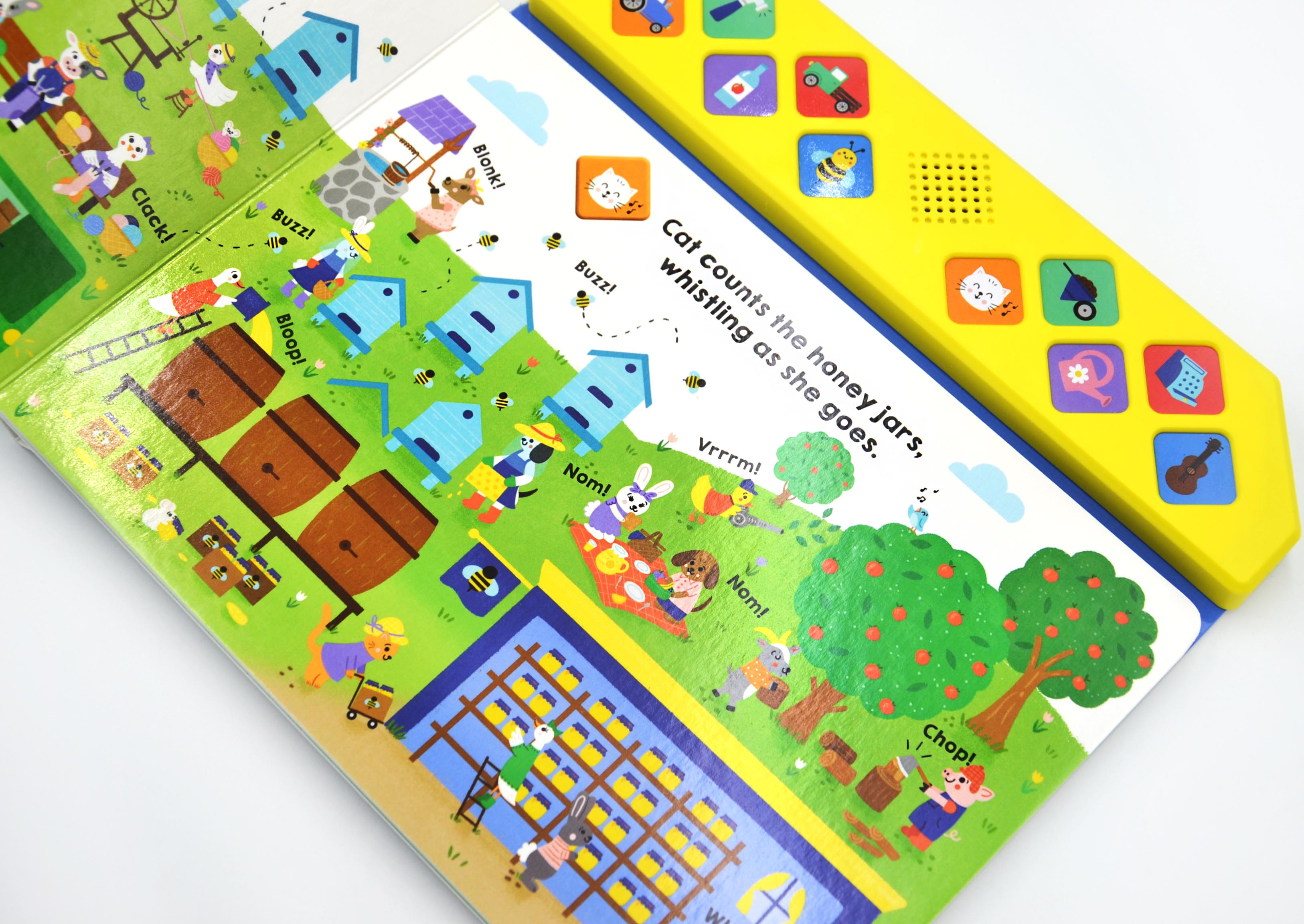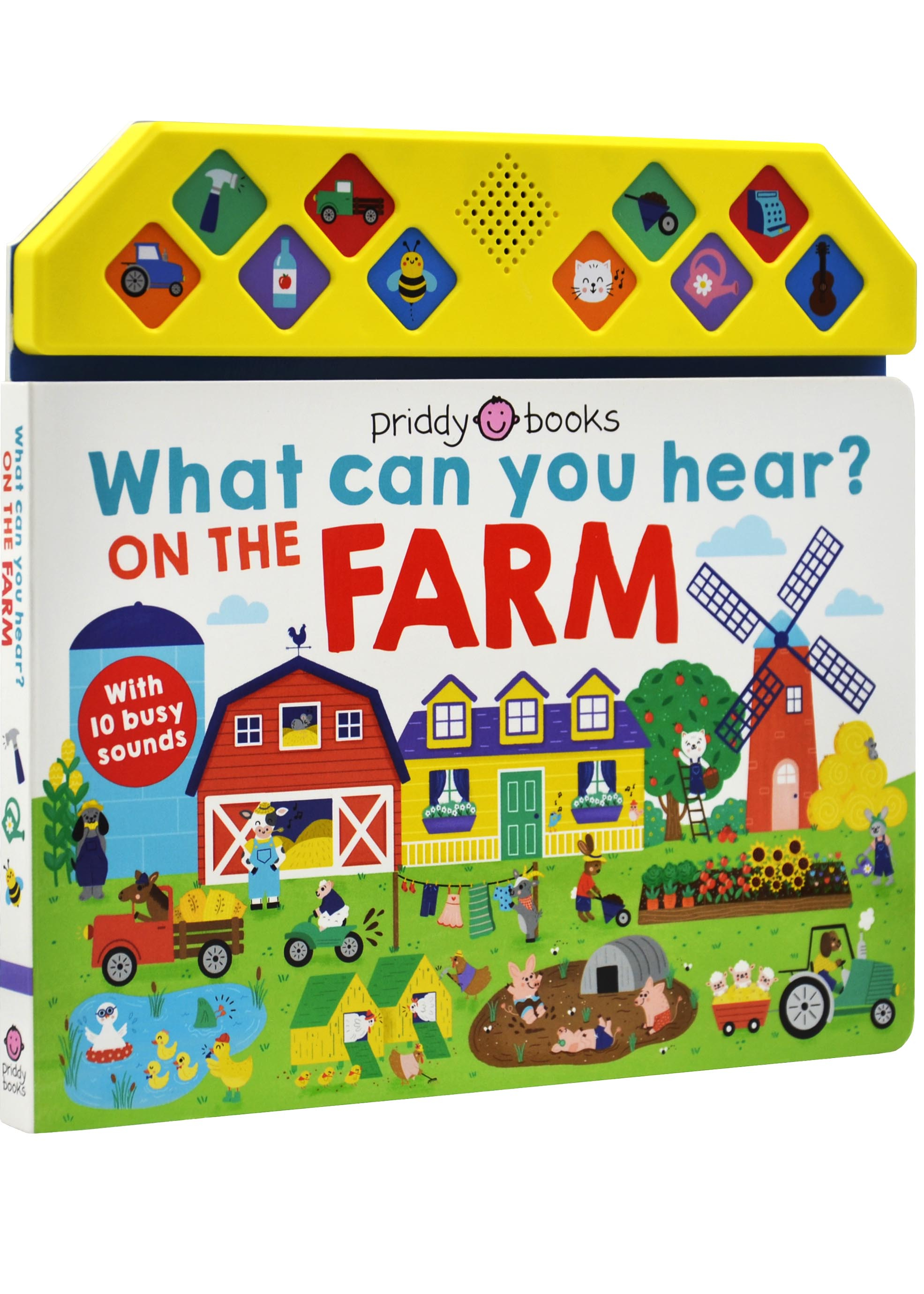 Young children will love being part of the action in What Can You Hear?: On the Farm —a fantastic new sound book series by Priddy Books.From a chugging tractor to juicing apples, and more, there are 10 busy farm sounds to discover in this unique board book. Children will love pressing the diamond-shaped buttons and listening to the sounds as they spot lots of fun things on the farm. Children can meet the different animals as they make cherry pies, fresh fruit juices, and lots of other fantastic items as they prepare for market day!