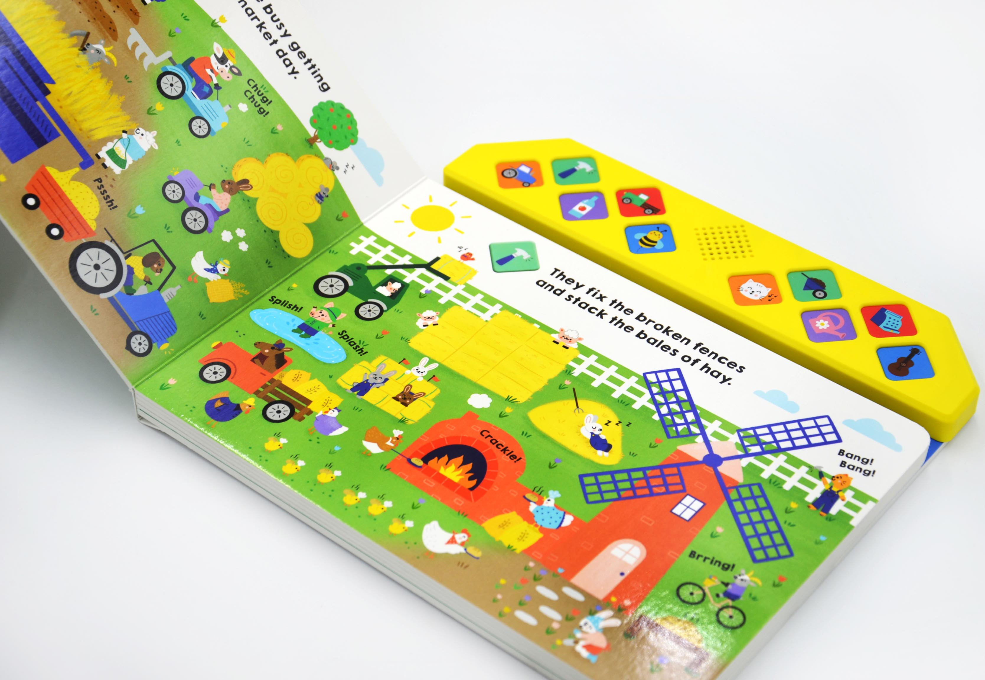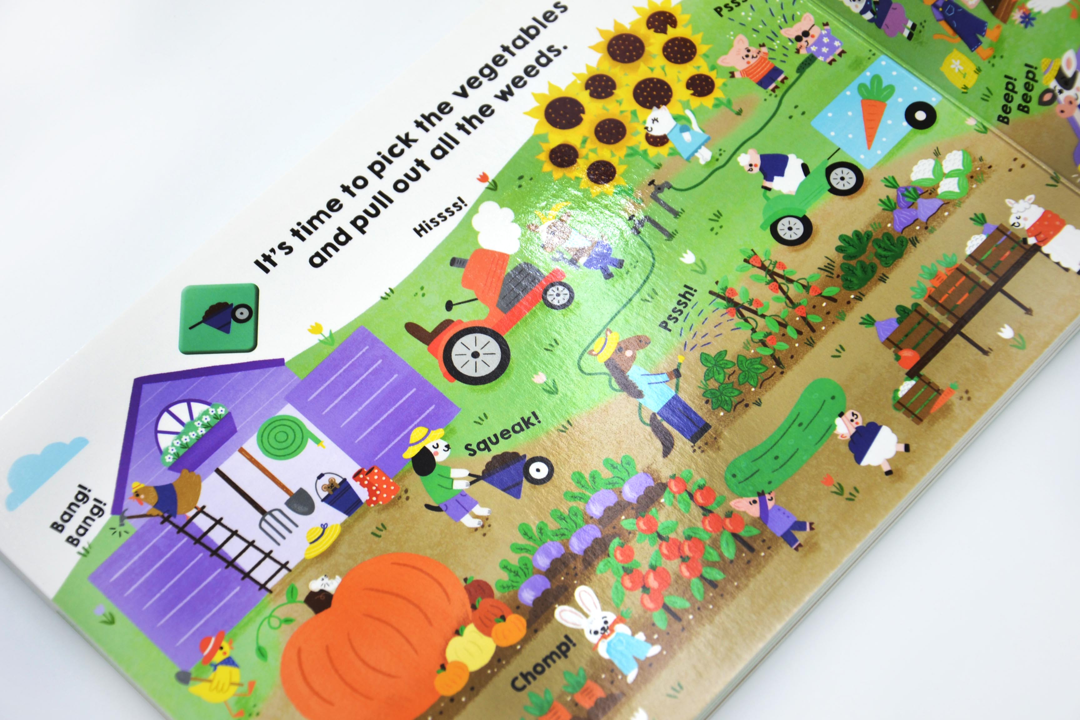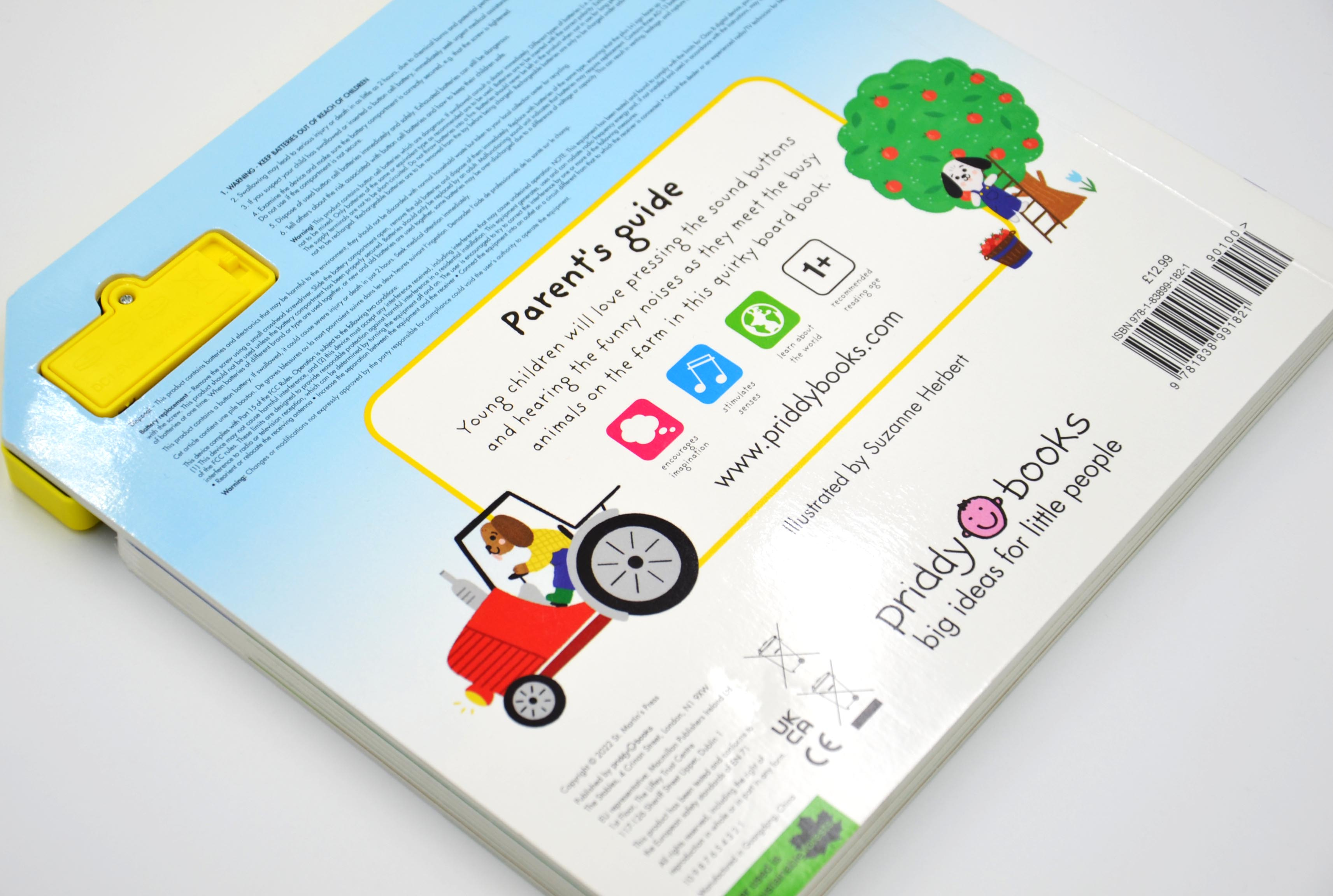 Від гучного трактора до приготування яблучного соку та багато іншого – у цій унікальній картонній книжці є 10 цікавих звуків ферми. Малюки будуть у захваті, натискаючи на ромбоподібні кнопки та слухаючи звуки, спостерігаючи за веселими подіями на фермі.