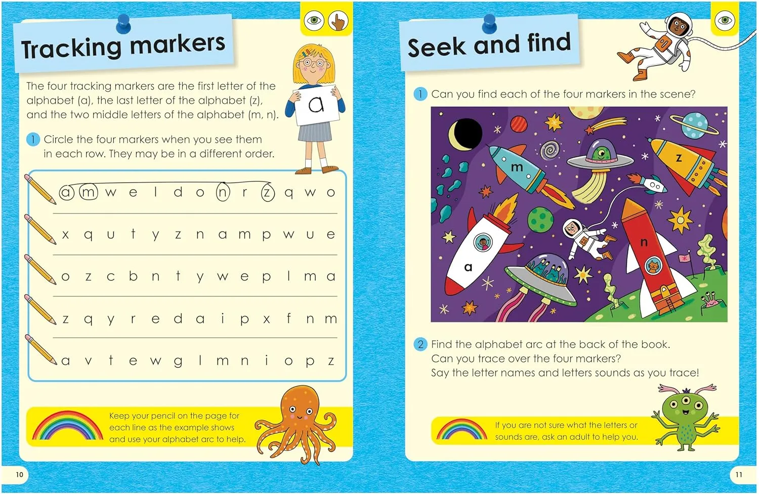 Книга пропонує мультисенсорне навчання, включаючи знімні картки та стирану алфавітну дугу.