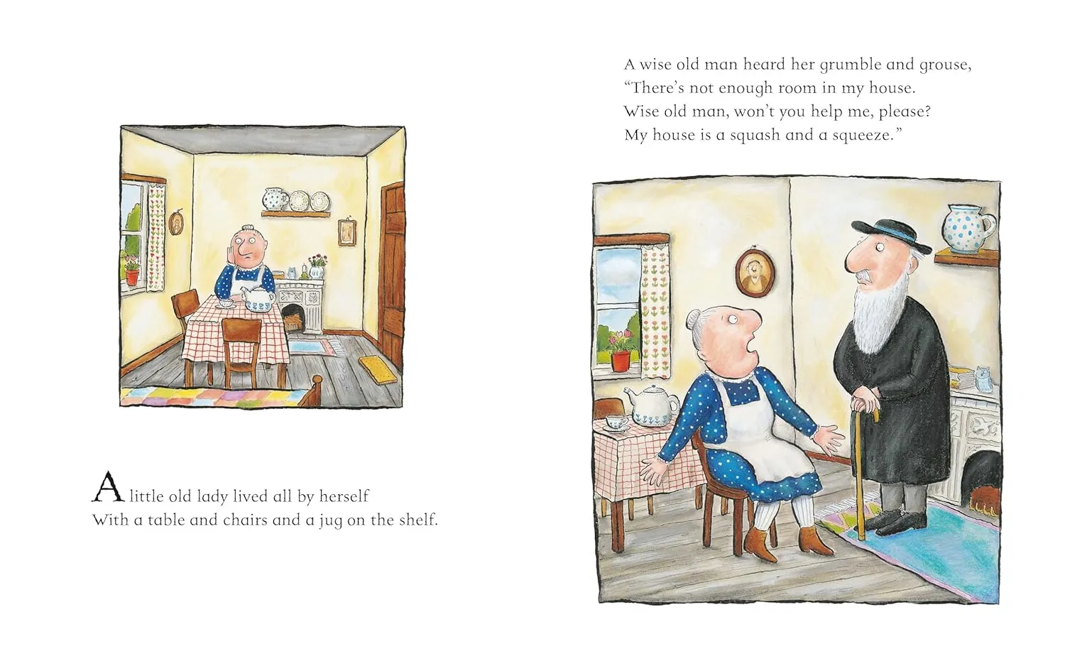 A little old lady lives all by herself in her house but she's not happy - it's just too small, even for one. Whatever can she do? The wise old man knows: bring in a flappy, scratchy, greedy, noisy crowd of farmyard animals. When she pushes them all out again, she'll be amazed at how big her house feels!