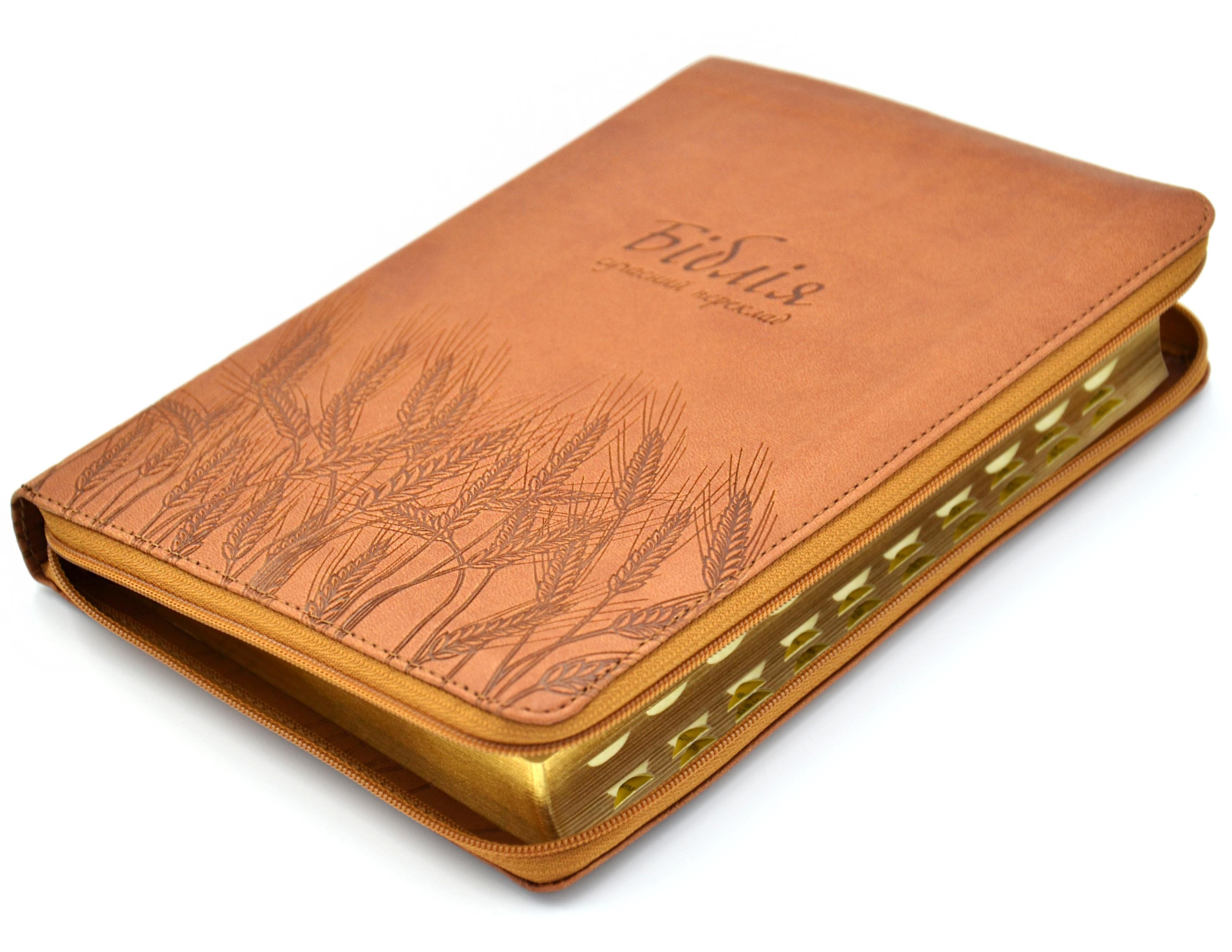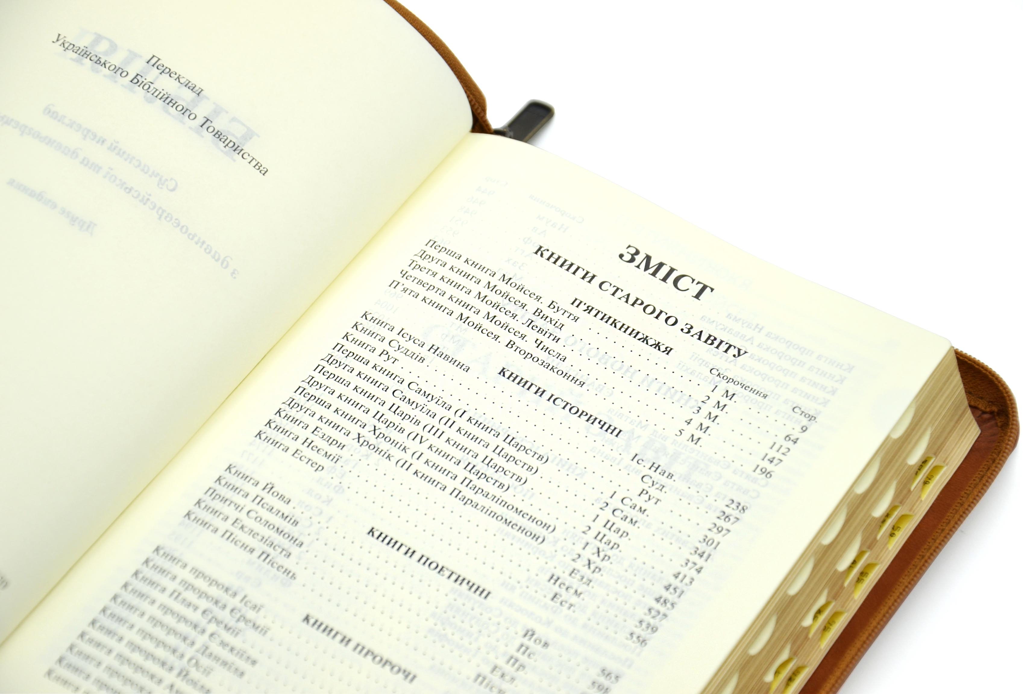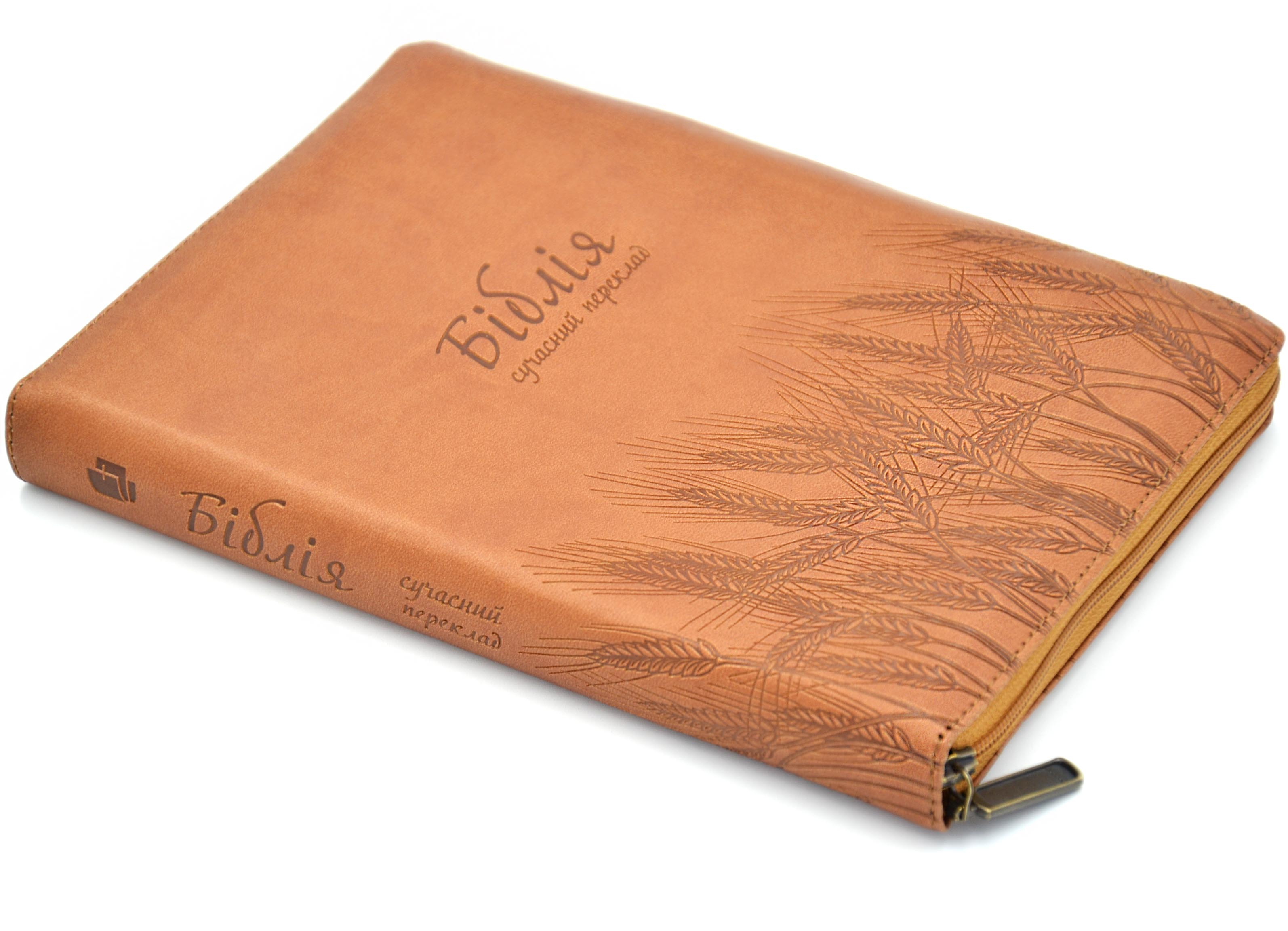 Книги Святого Письма Старого й Нового Заповіту, в сучасному перекладі із мови давньоєврейської й грецької. Текст на сторінках розміщений у дві колонки з паралельними місцями посередині, виноски-пояснення внизу сторінки. В книзі є закладка, що допоможе швидко знайти потрібну сторінку. Також книга має м'яку палітурку із замінника шкіри та за застібку-блискавку для зручного носіння.